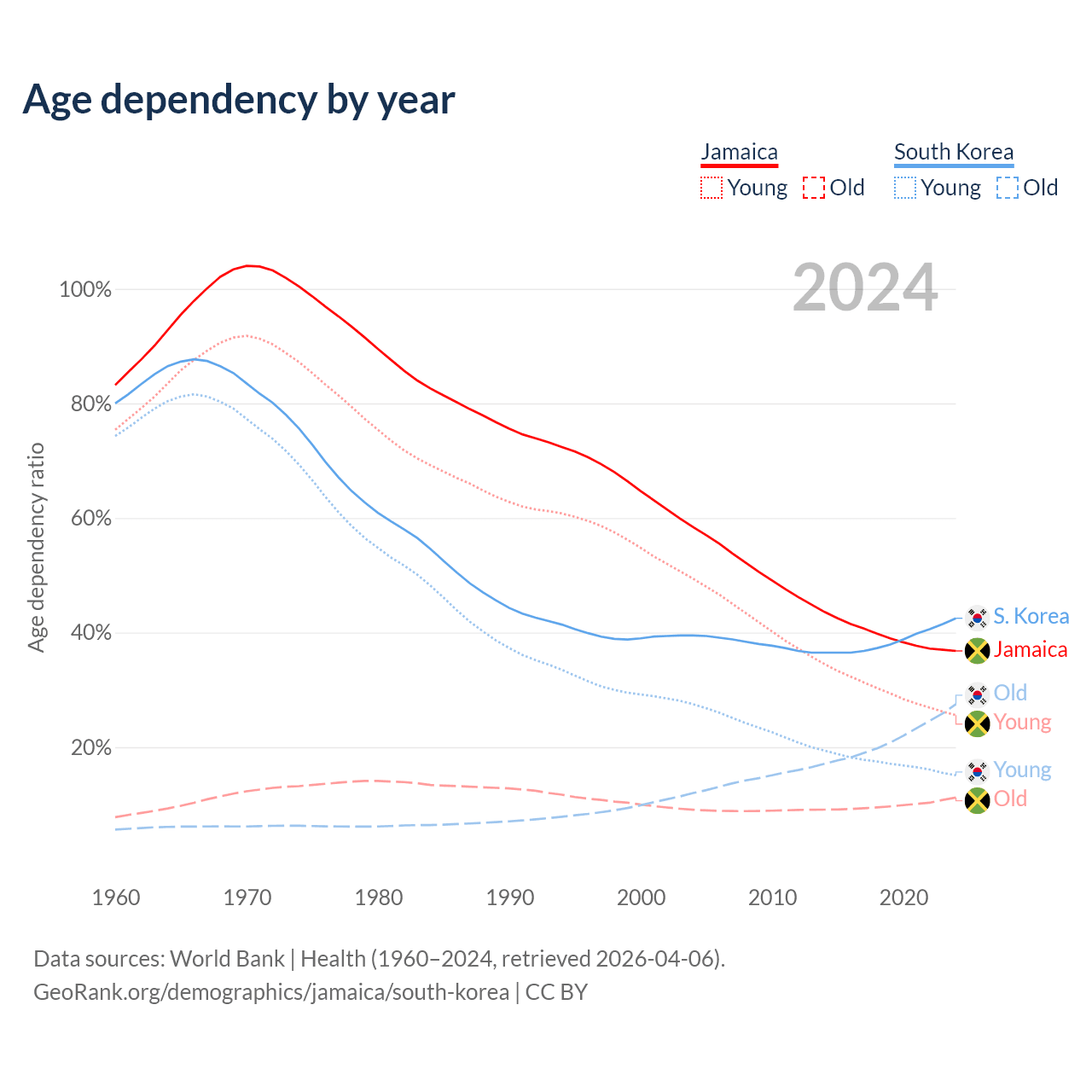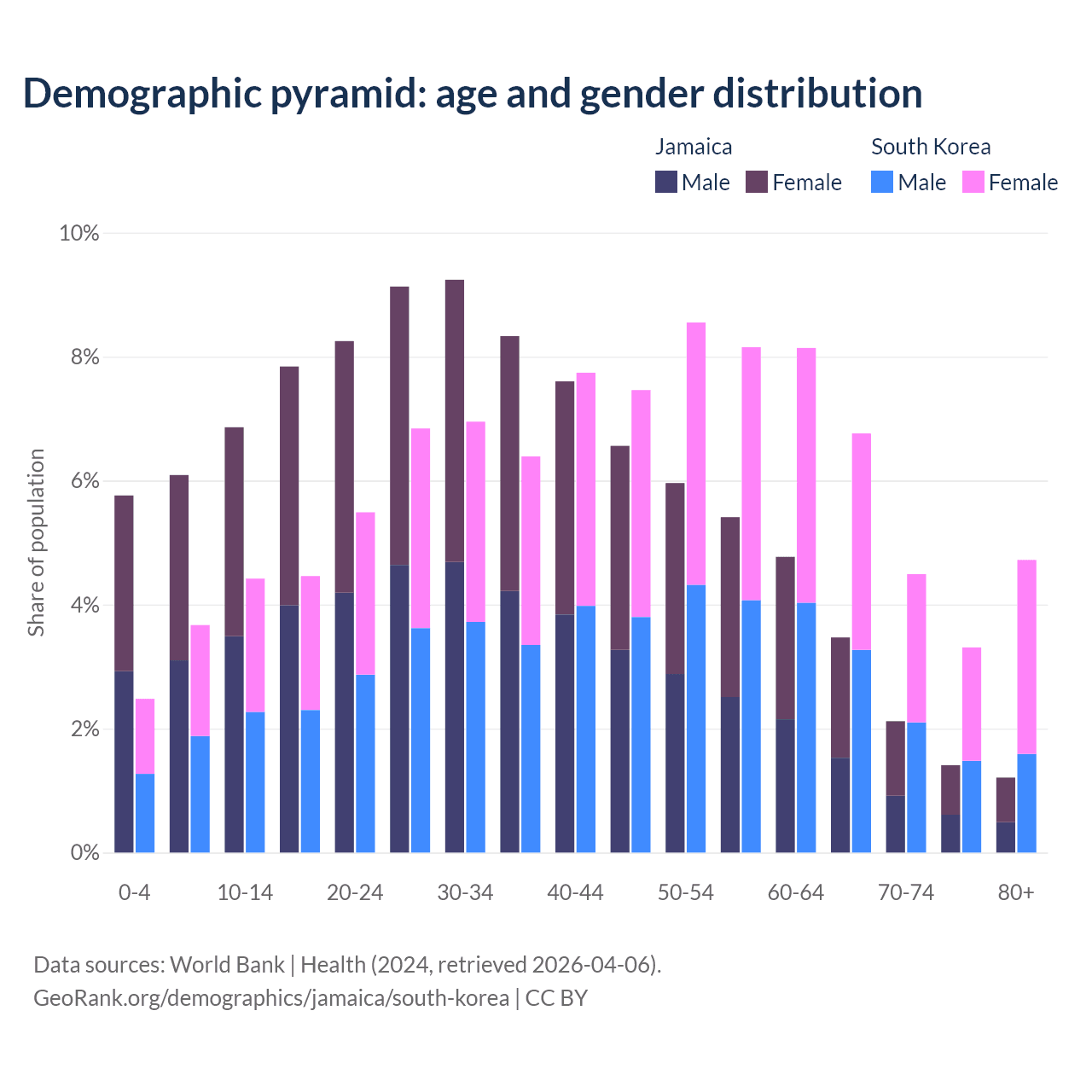 - Jamaica is ranked 87/196 by median age (oldest to youngest) vs 10/196 for South Korea.