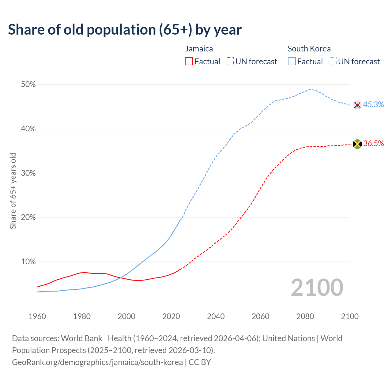 The share of older people aged 65 and over is 8.21% in Jamaica and 19.3% in South Korea. Life expectancy in Jamaica compared to South Korea .