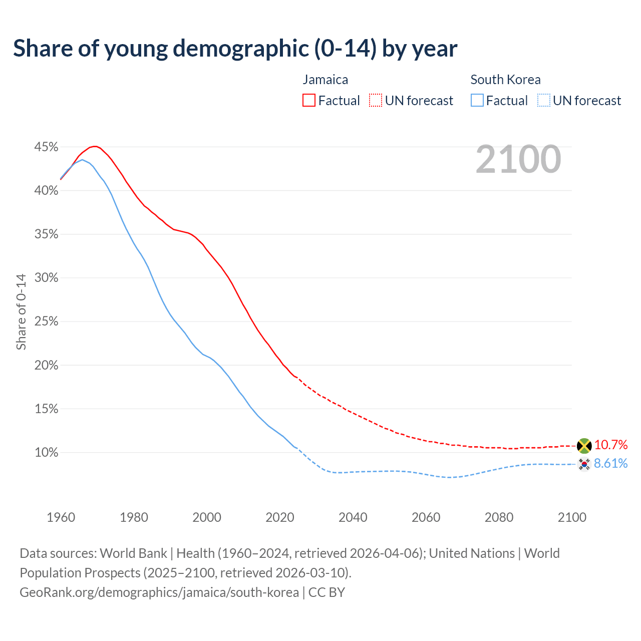 - The share of young demographic (0-15 years old) in Jamaica is 18.7% vs 10.6% in South Korea.