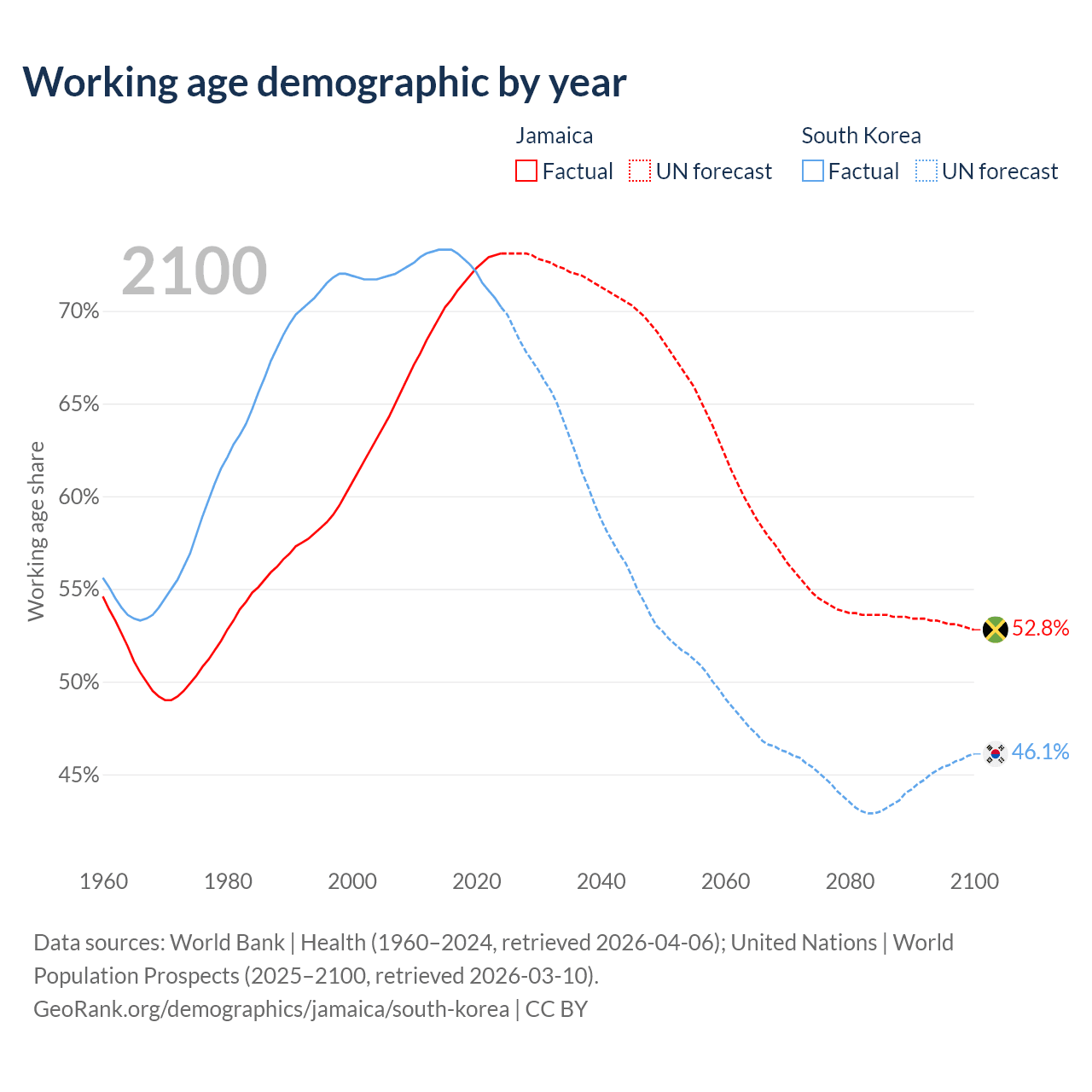 - Jamaica has 2.07M working age adults (aged 15-64) vs 36.2M in South Korea.