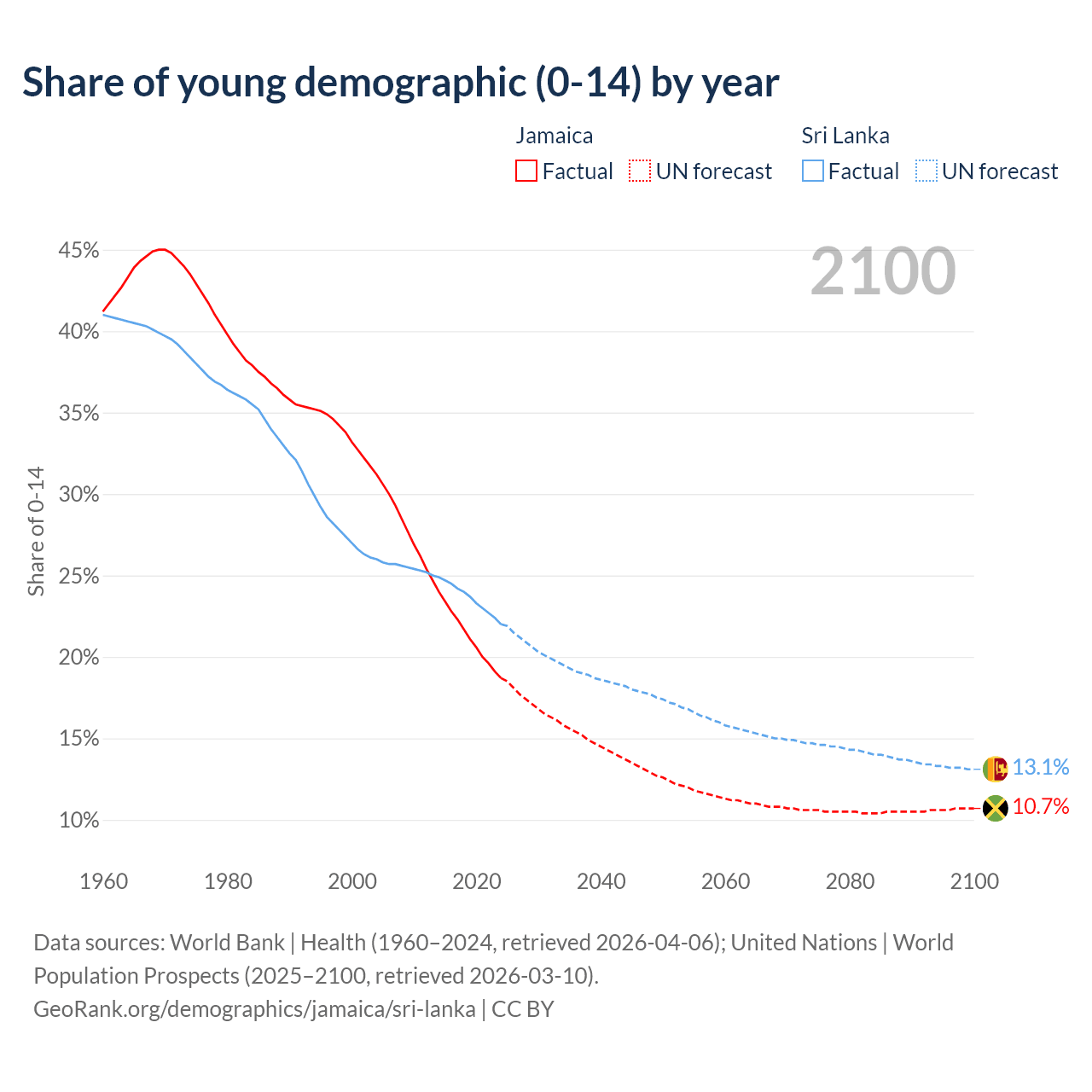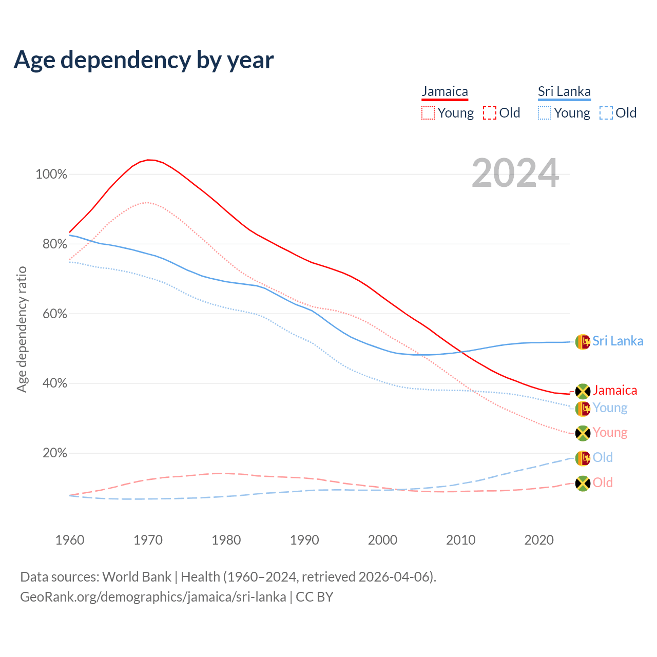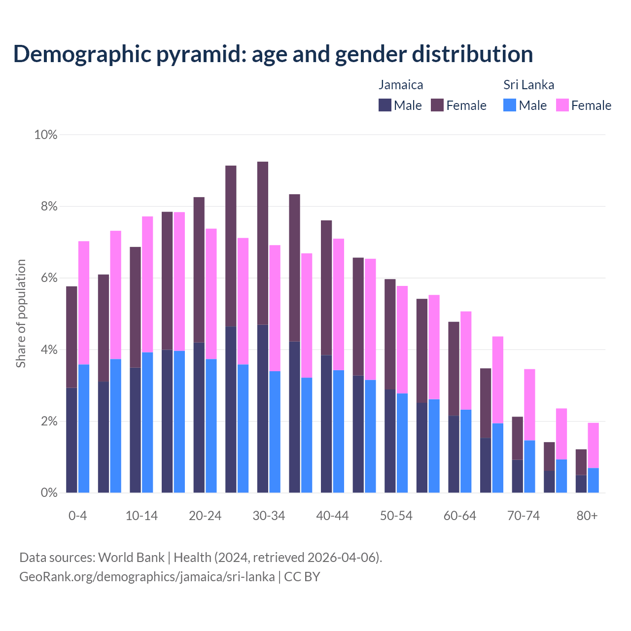 - Jamaica is ranked 87/196 by median age (oldest to youngest) vs 81/196 for Sri Lanka.