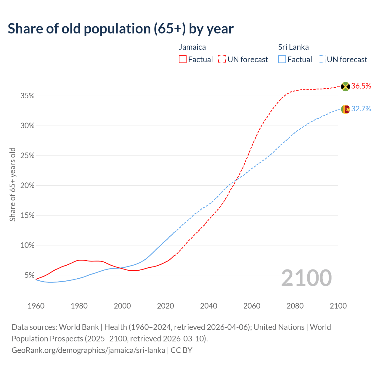The share of older people aged 65 and over is 8.21% in Jamaica and 12.1% in Sri Lanka. Life expectancy in Jamaica compared to Sri Lanka .
