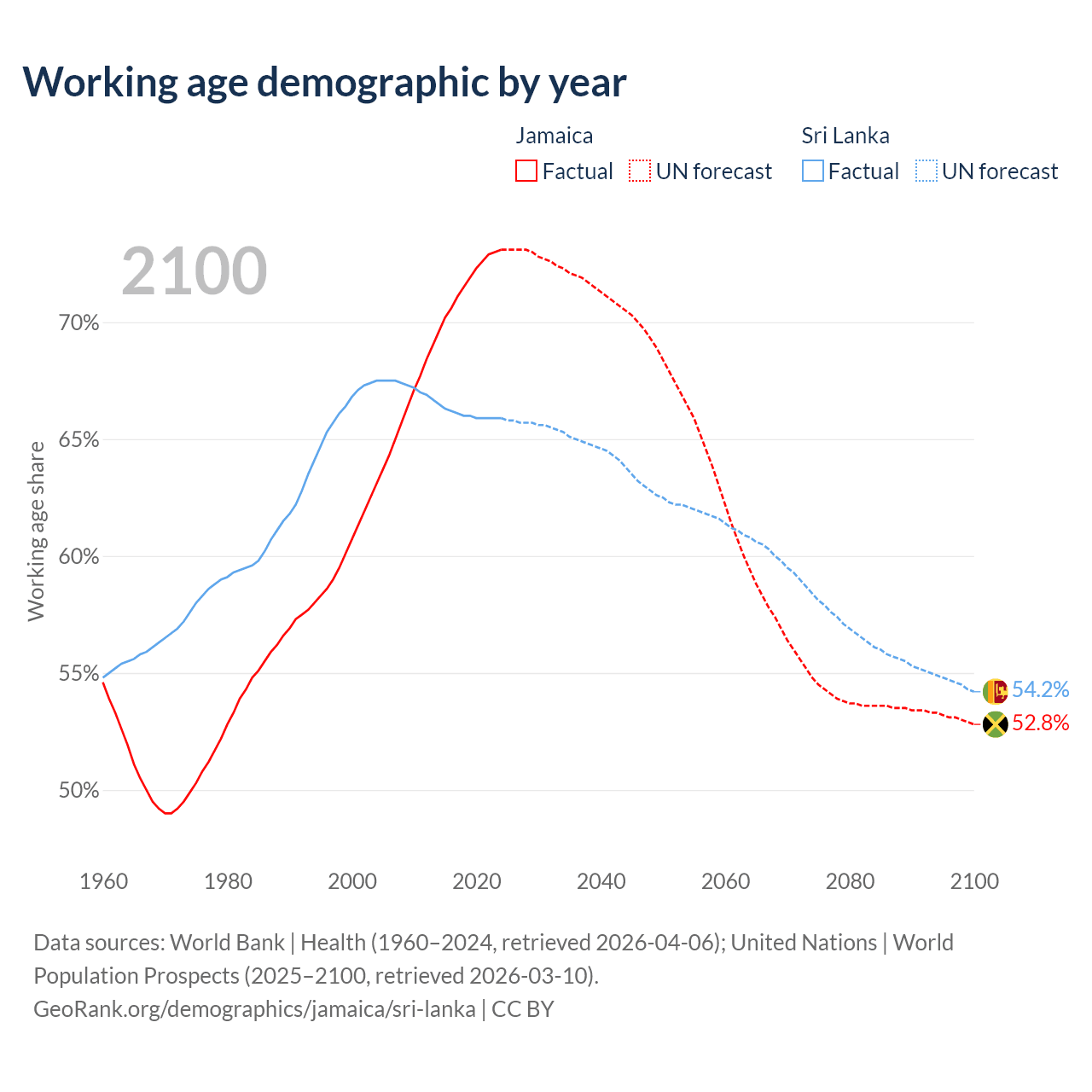- Jamaica has 2.07M working age adults (aged 15-64) vs 14.6M in Sri Lanka.