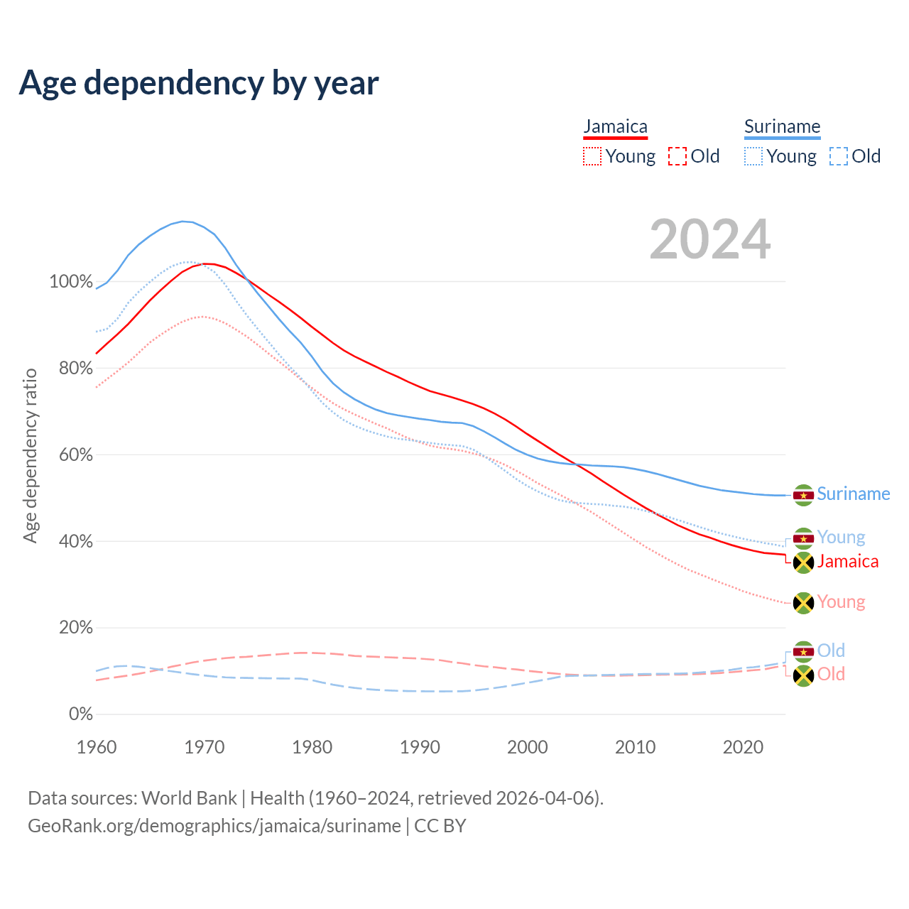 - Jamaica is ranked 87/196 by median age (oldest to youngest) vs 109/196 for Suriname.
