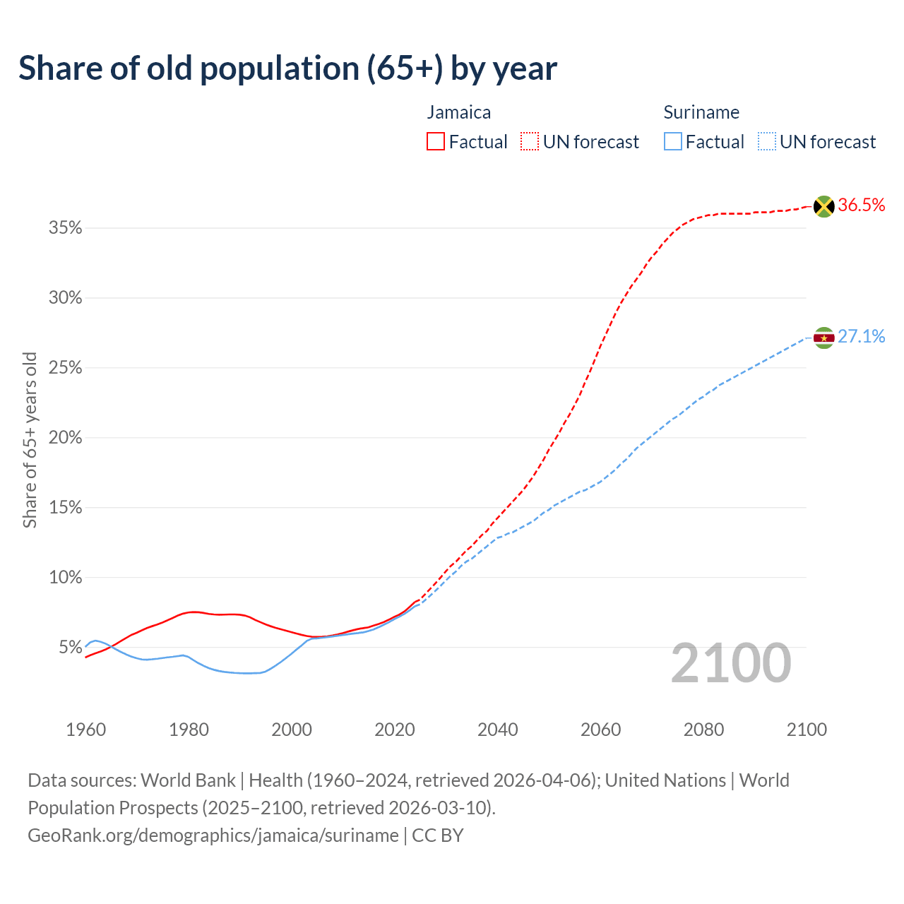 The share of older people aged 65 and over is 8.21% in Jamaica and 7.9% in Suriname. Life expectancy in Jamaica compared to Suriname .