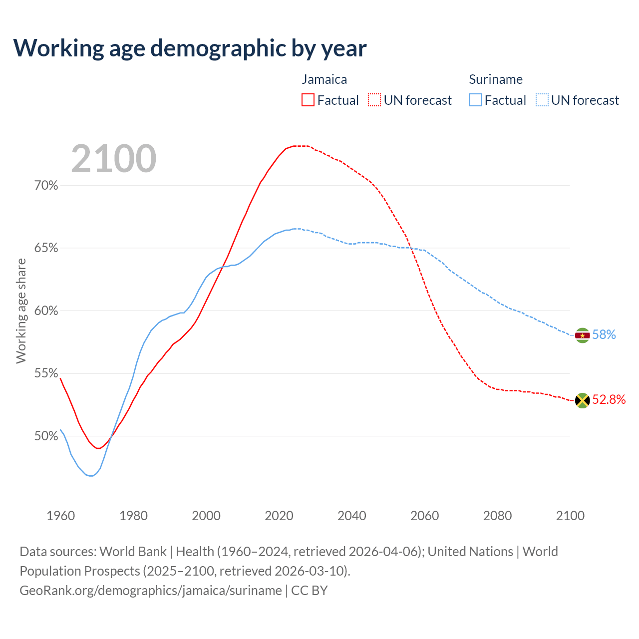 - Jamaica has 2.07M working age adults (aged 15-64) vs 430K in Suriname.