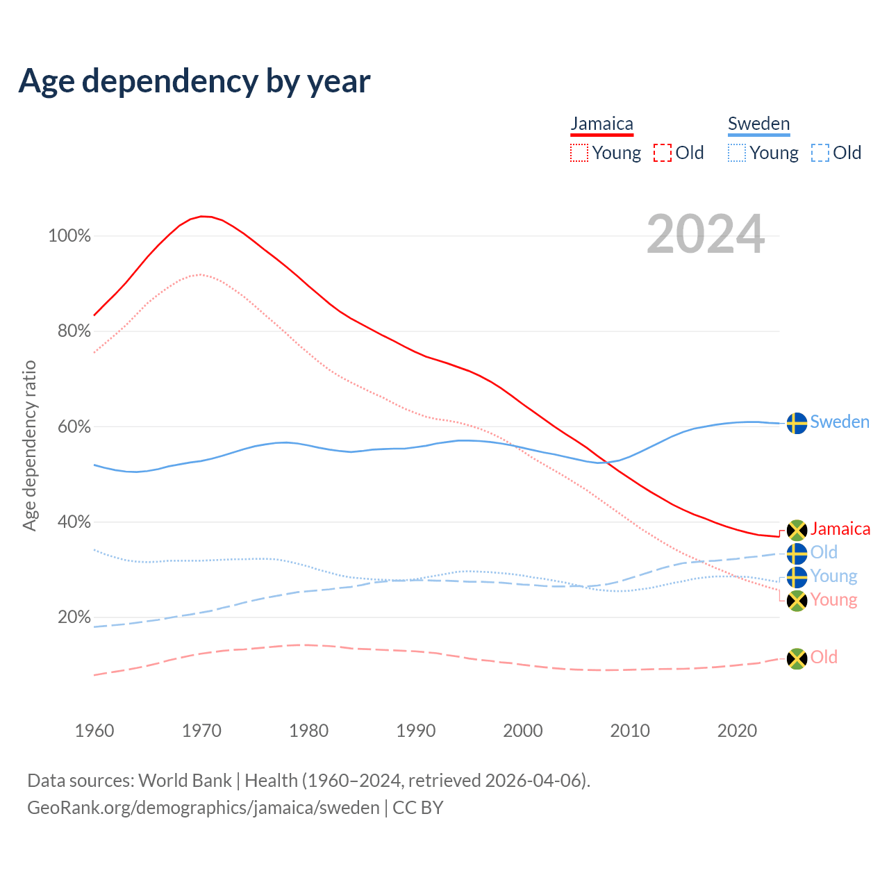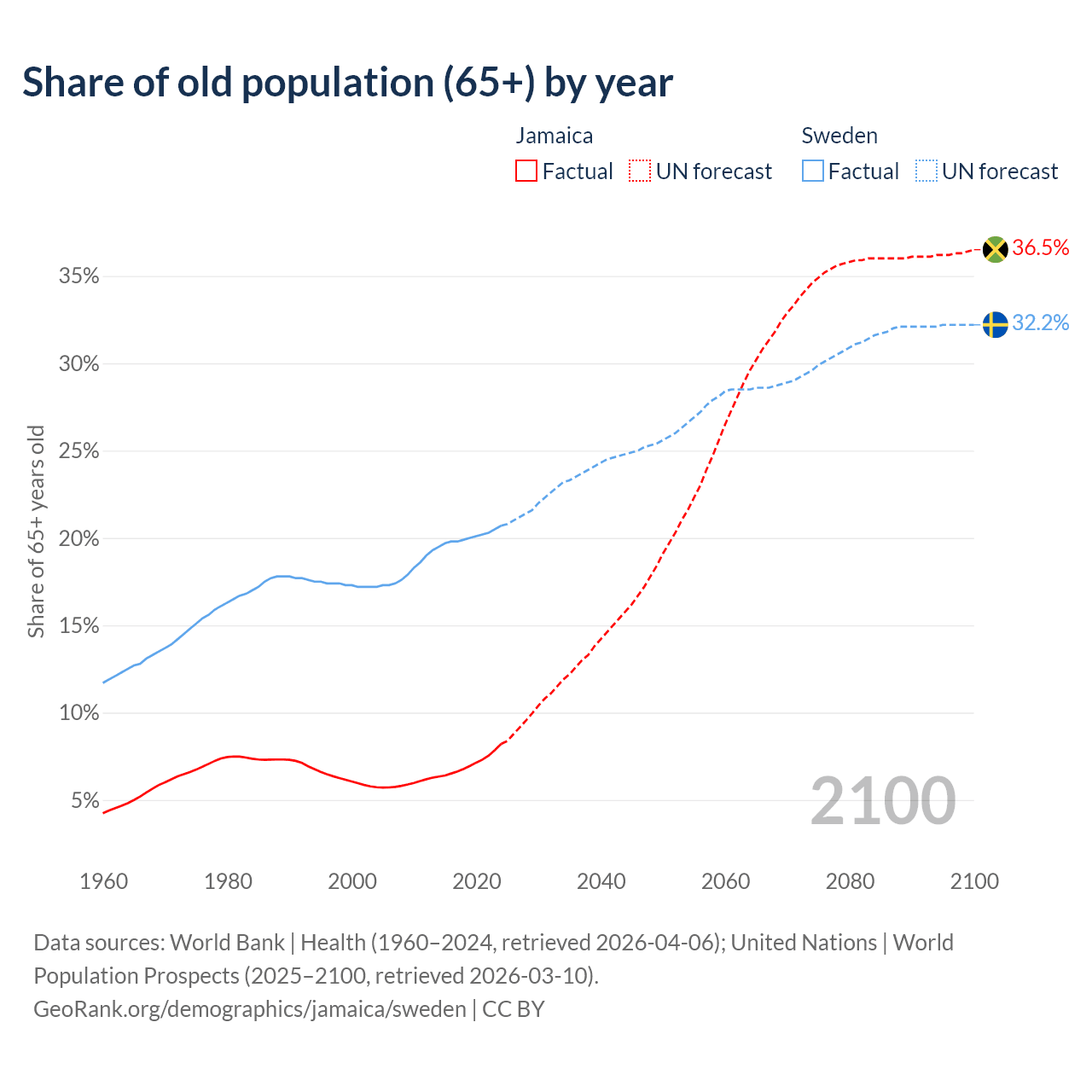 The share of older people aged 65 and over is 8.21% in Jamaica and 20.7% in Sweden. Life expectancy in Jamaica compared to Sweden .