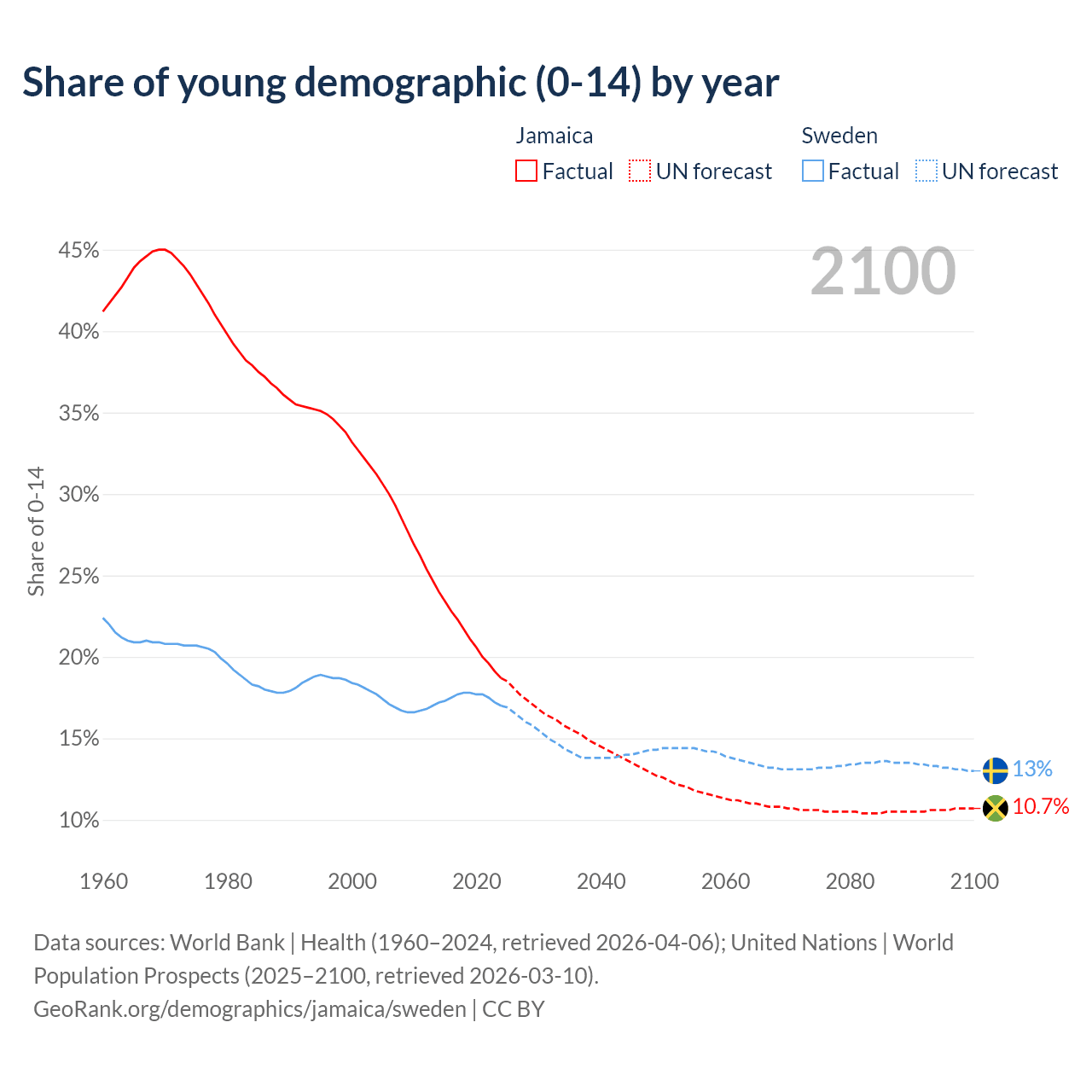- The share of young demographic (0-15 years old) in Jamaica is 18.7% vs 17% in Sweden.