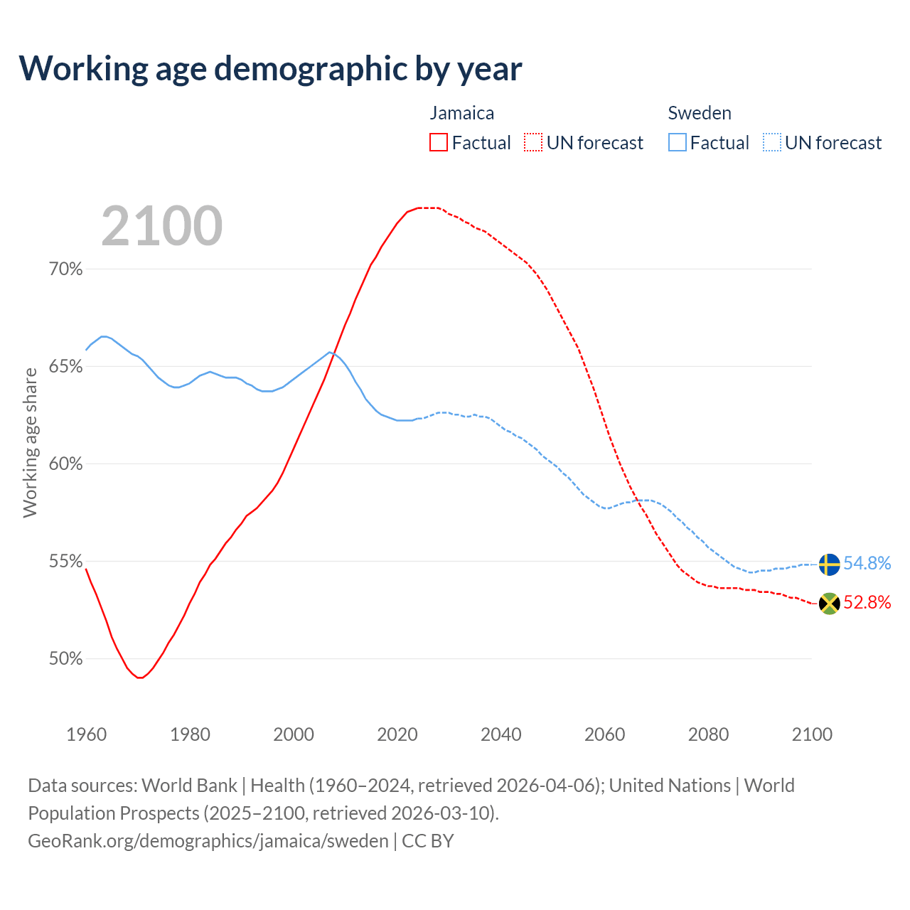 Median age Jamaica vs Sweden, 1960-2100
