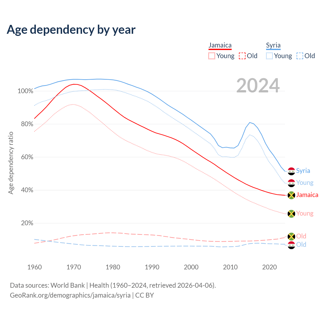 - The share of old-age demographic (65+) in Jamaica is 8.21% vs 4.74% in Syria.