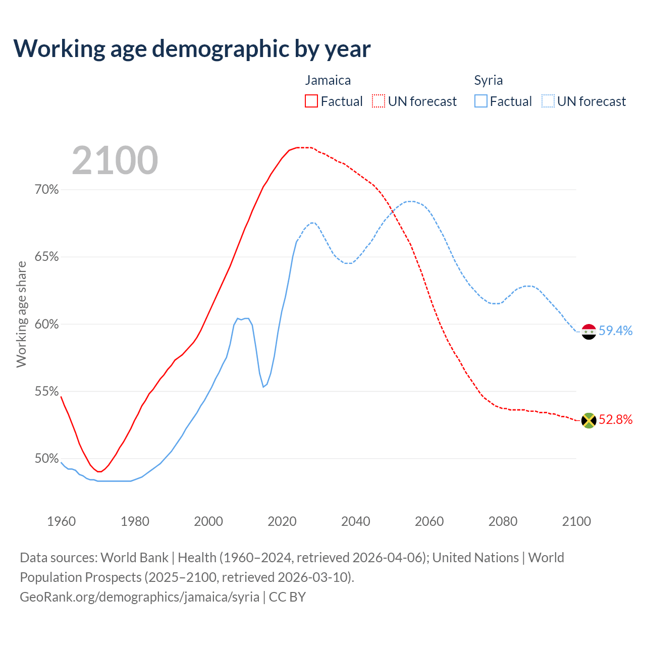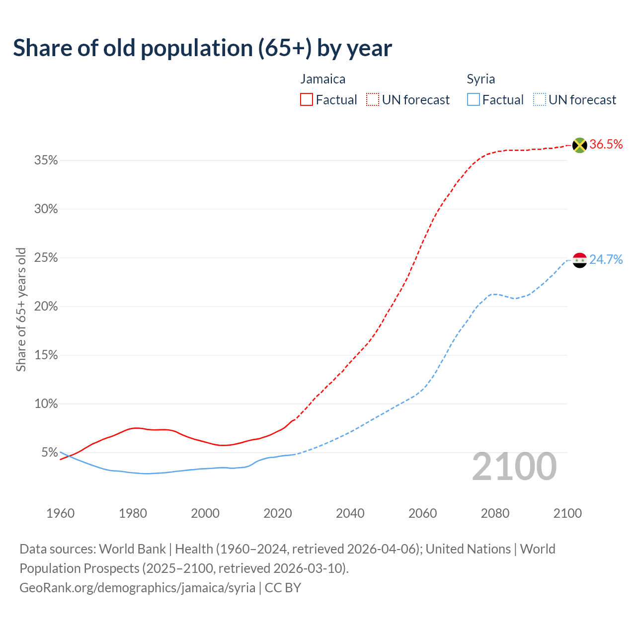 The share of older people aged 65 and over is 8.21% in Jamaica and 4.74% in Syria. Life expectancy in Jamaica compared to Syria .
