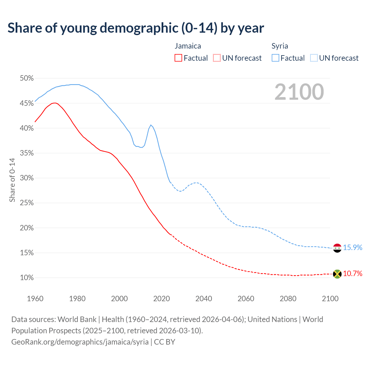 - The share of young demographic (0-15 years old) in Jamaica is 18.7% vs 29.2% in Syria.
