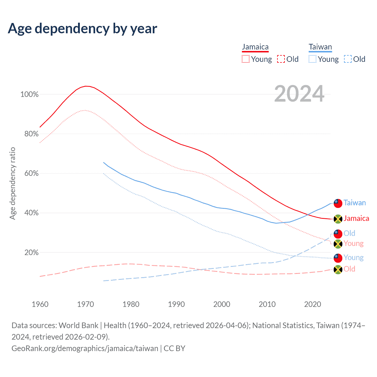 Data sources: World Bank | Health (1960–2024, retrieved 2026-04-06); U.S. Census Bureau (1960–2024, retrieved 2026-02-08); National Statistics, Taiwan (1974–2024, retrieved 2026-02-09).