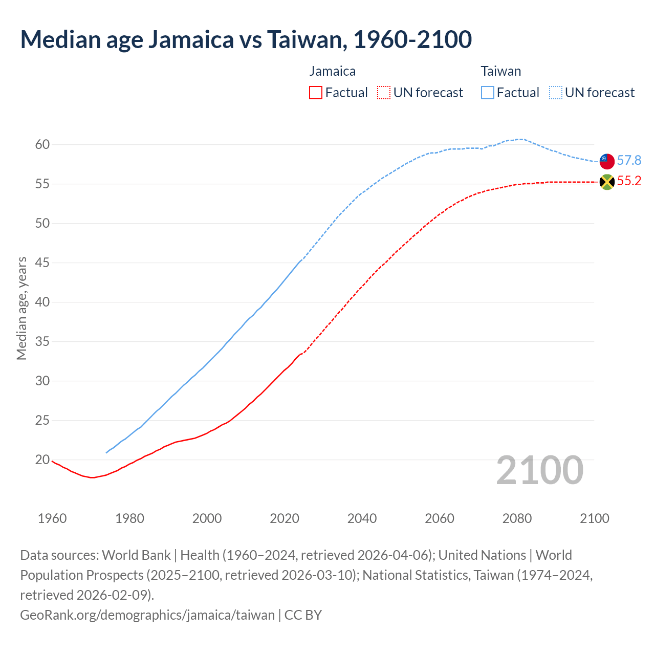 Median age Jamaica vs Taiwan, 1960-2100