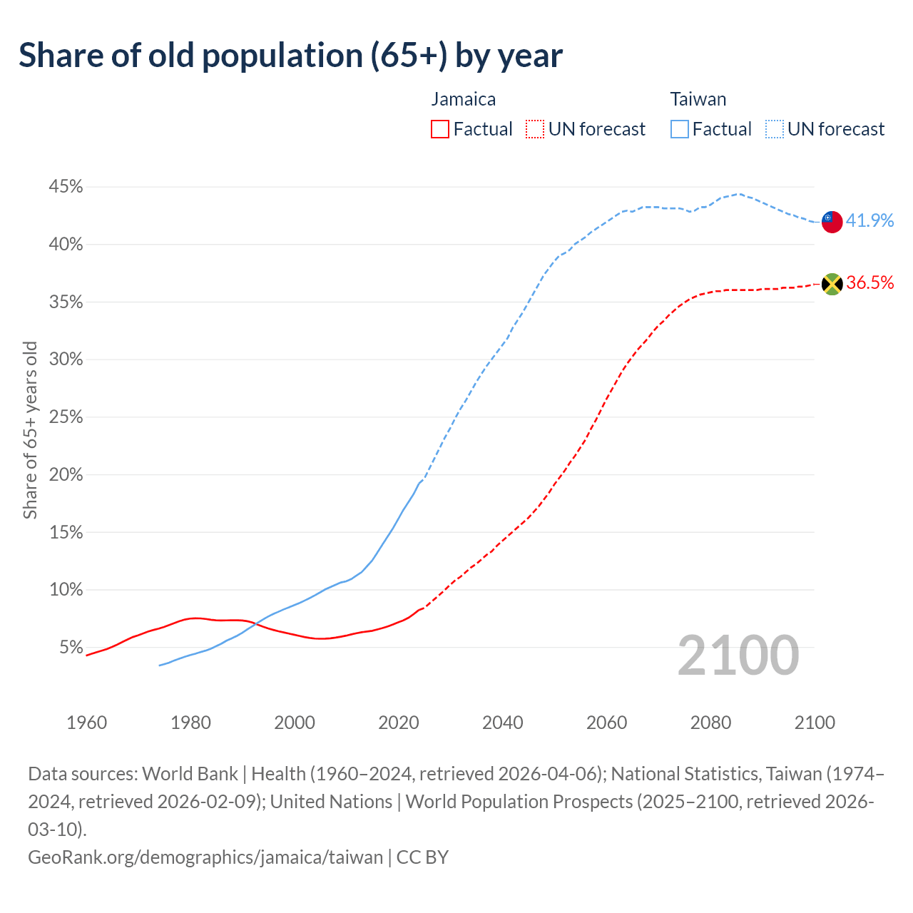 The share of older people aged 65 and over is 8.21% in Jamaica and 19.2% in Taiwan. Life expectancy in Jamaica compared to Taiwan .