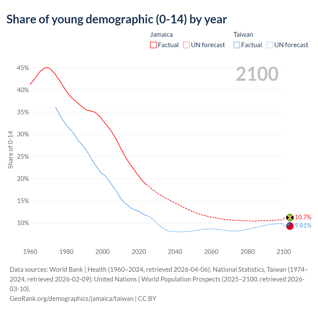 - The share of young demographic (0-15 years old) in Jamaica is 18.7% vs 11.7% in Taiwan.