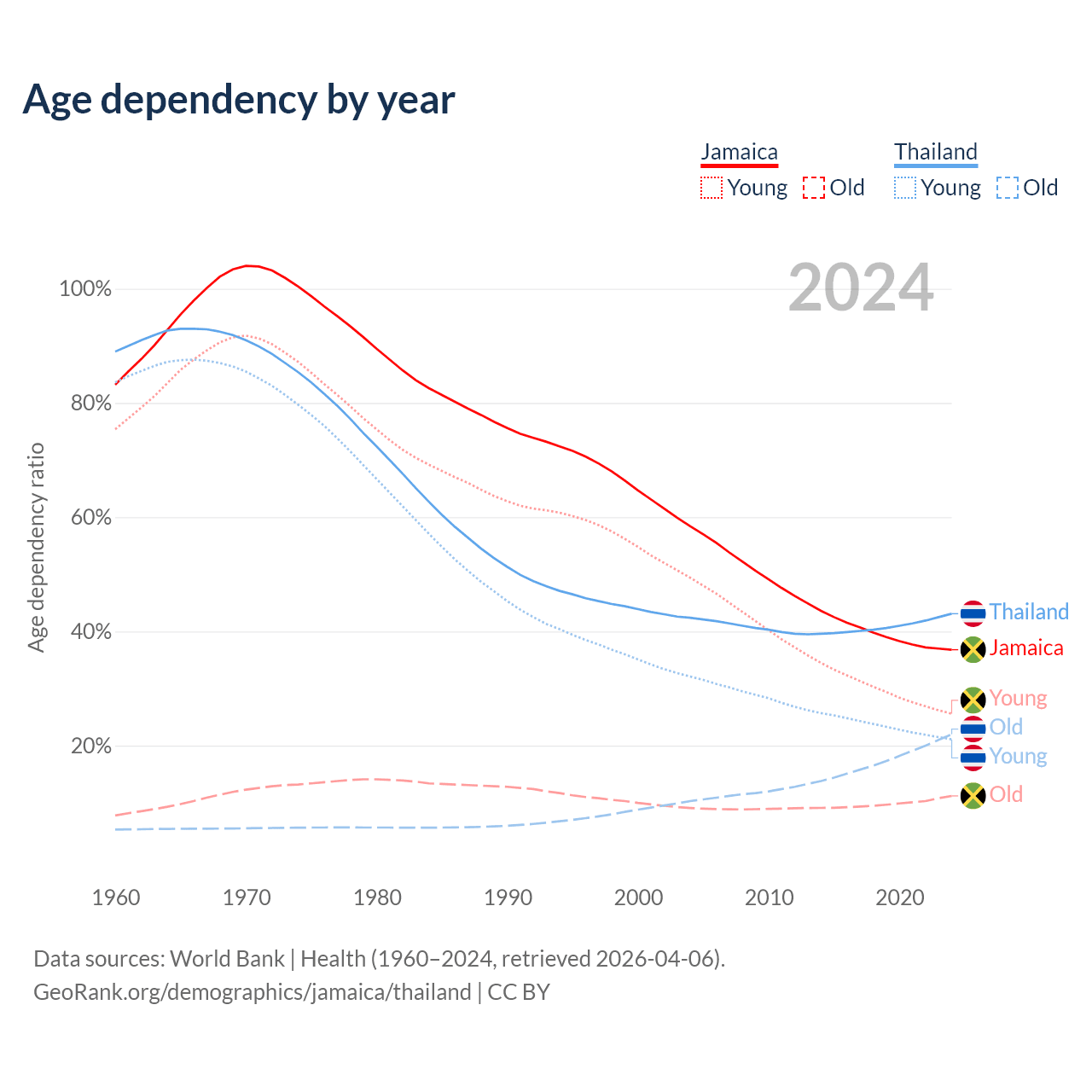 The share of older people aged 65 and over is 8.21% in Jamaica and 15.4% in Thailand. Life expectancy in Jamaica compared to Thailand .