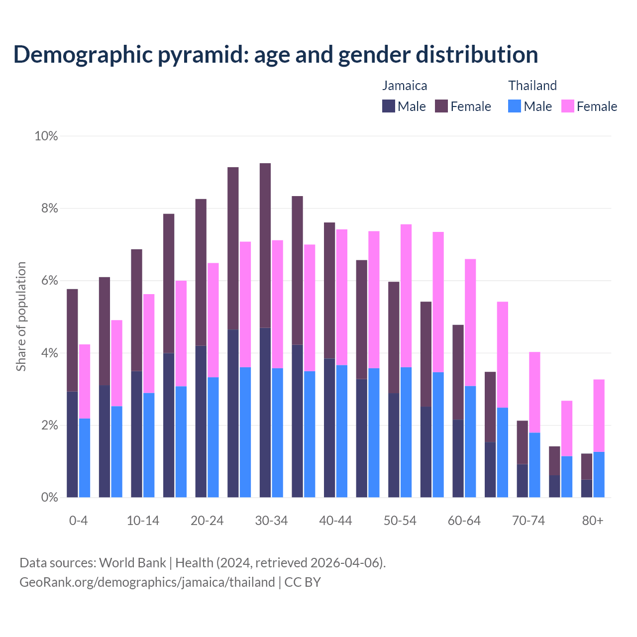 - Jamaica is ranked 87/196 by median age (oldest to youngest) vs 40/196 for Thailand.