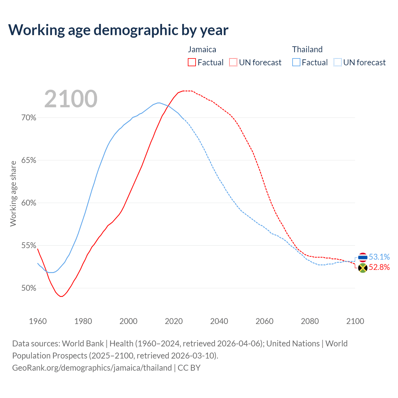 Median age Jamaica vs Thailand, 1960-2100