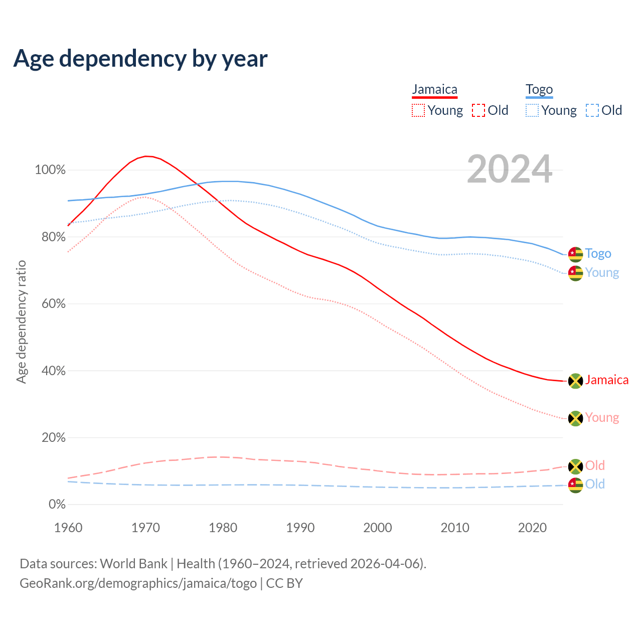 - The share of old-age demographic (65+) in Jamaica is 8.21% vs 3.21% in Togo.