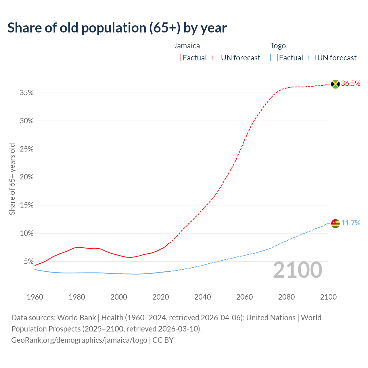 The share of older people aged 65 and over is 8.21% in Jamaica and 3.21% in Togo. Life expectancy in Jamaica compared to Togo .