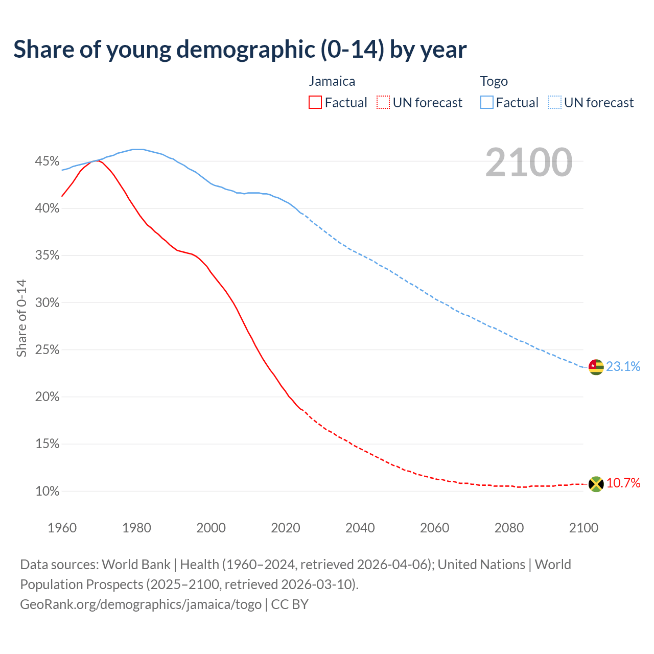 - The share of young demographic (0-15 years old) in Jamaica is 18.7% vs 39.5% in Togo.