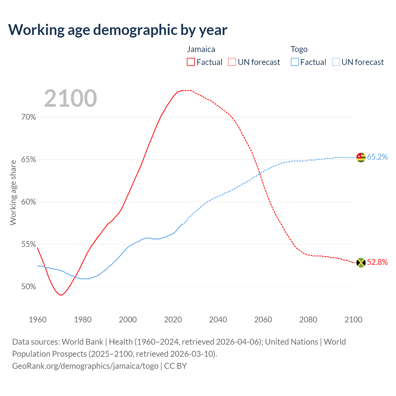 - Jamaica has 2.07M working age adults (aged 15-64) vs 5.72M in Togo.