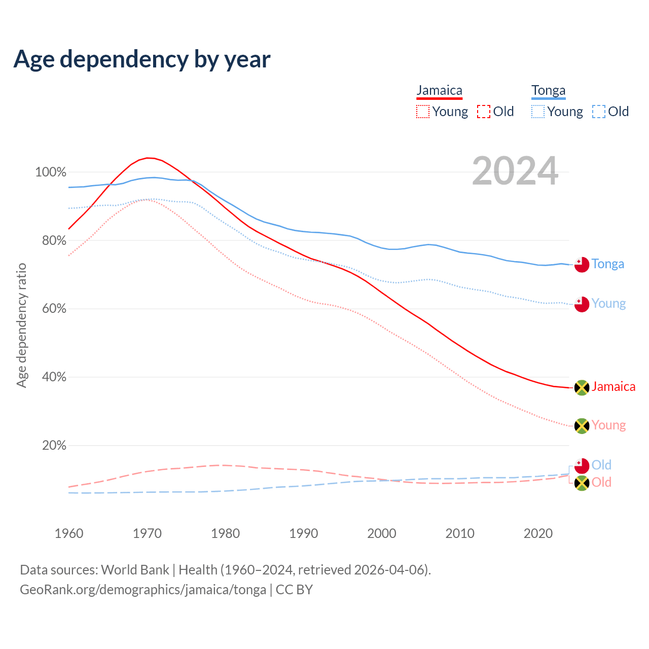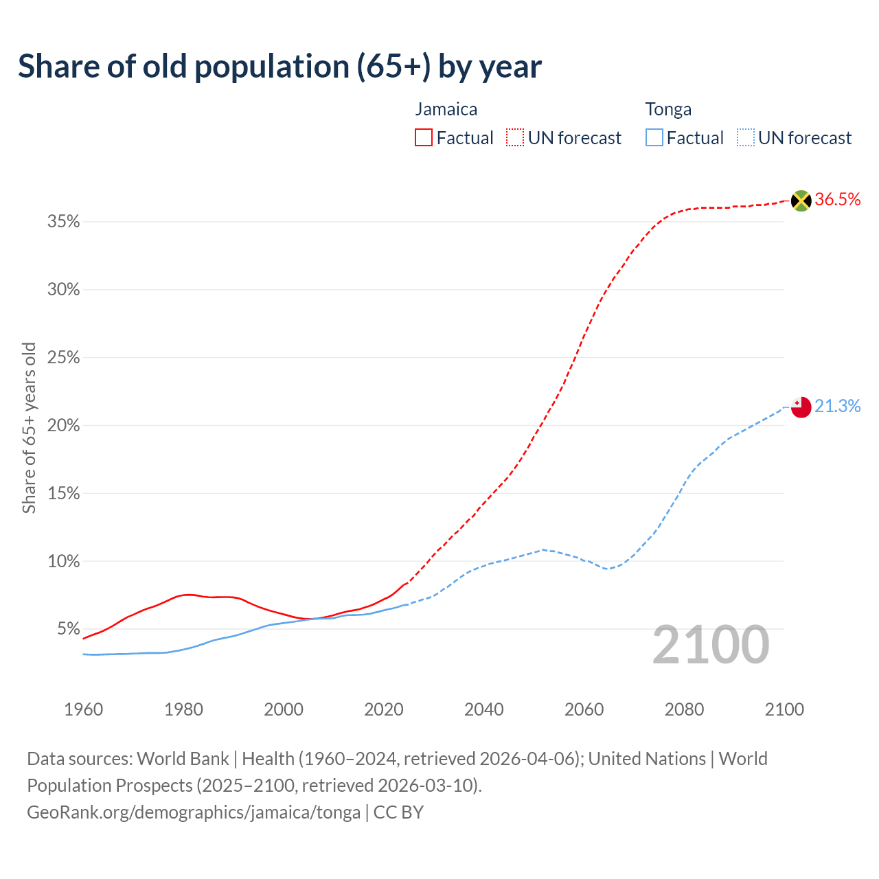 - The share of old-age demographic (65+) in Jamaica is 8.21% vs 6.72% in Tonga.