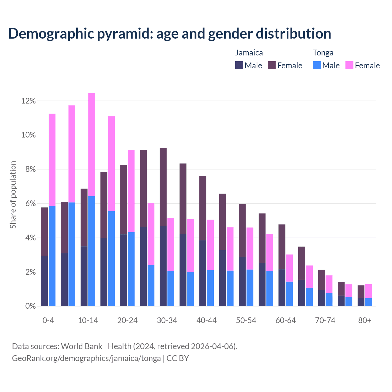 - Jamaica is ranked 87/196 by median age (oldest to youngest) vs 149/196 for Tonga.