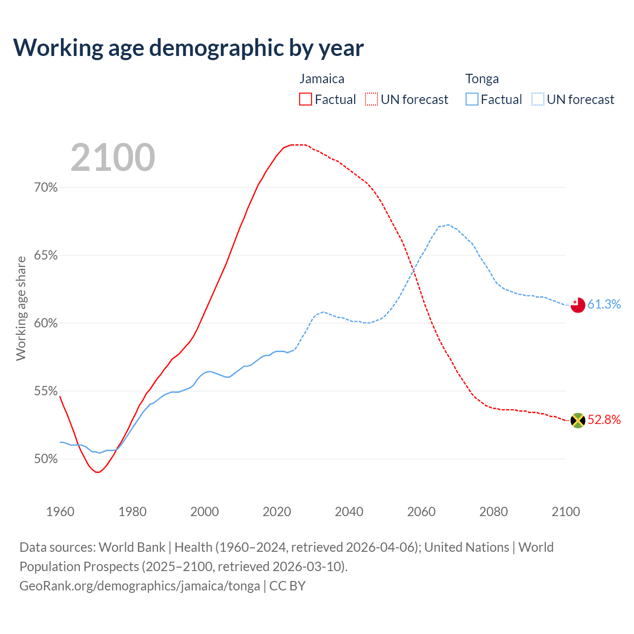 - Jamaica has 2.07M working age adults (aged 15-64) vs 59.8K in Tonga.