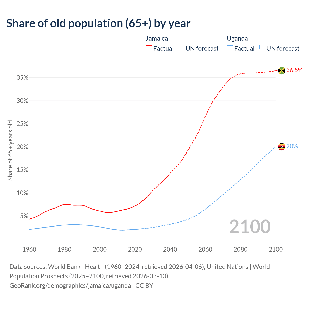 The share of older people aged 65 and over is 8.21% in Jamaica and 2.19% in Uganda. Life expectancy in Jamaica compared to Uganda .