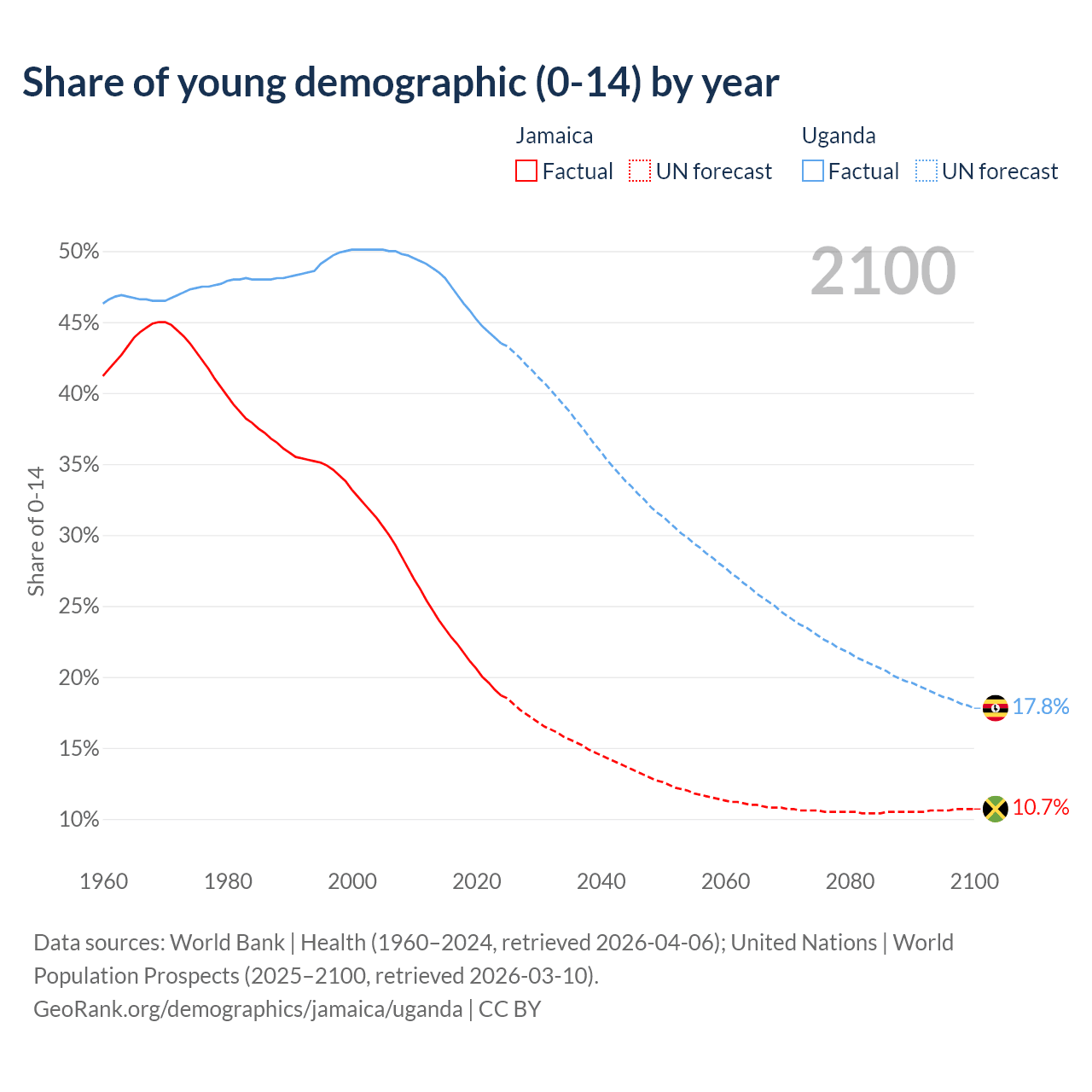 - Jamaica is ranked 87/196 by median age (oldest to youngest) vs 187/196 for Uganda.
