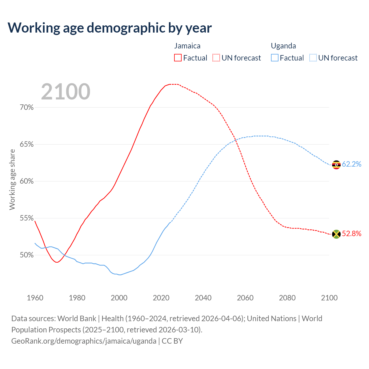 - Jamaica has 2.07M working age adults (aged 15-64) vs 28.9M in Uganda.