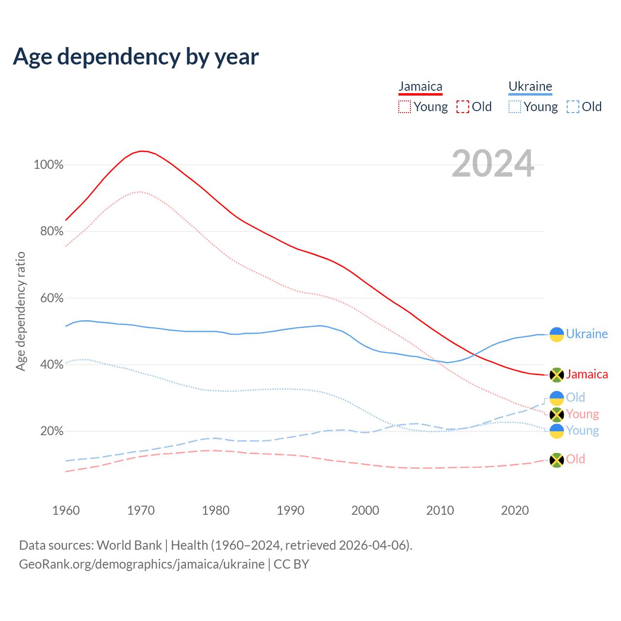Data sources: World Bank | Health (1960–2024, retrieved 2026-04-06); U.S. Census Bureau (1960–2024, retrieved 2026-02-08).
