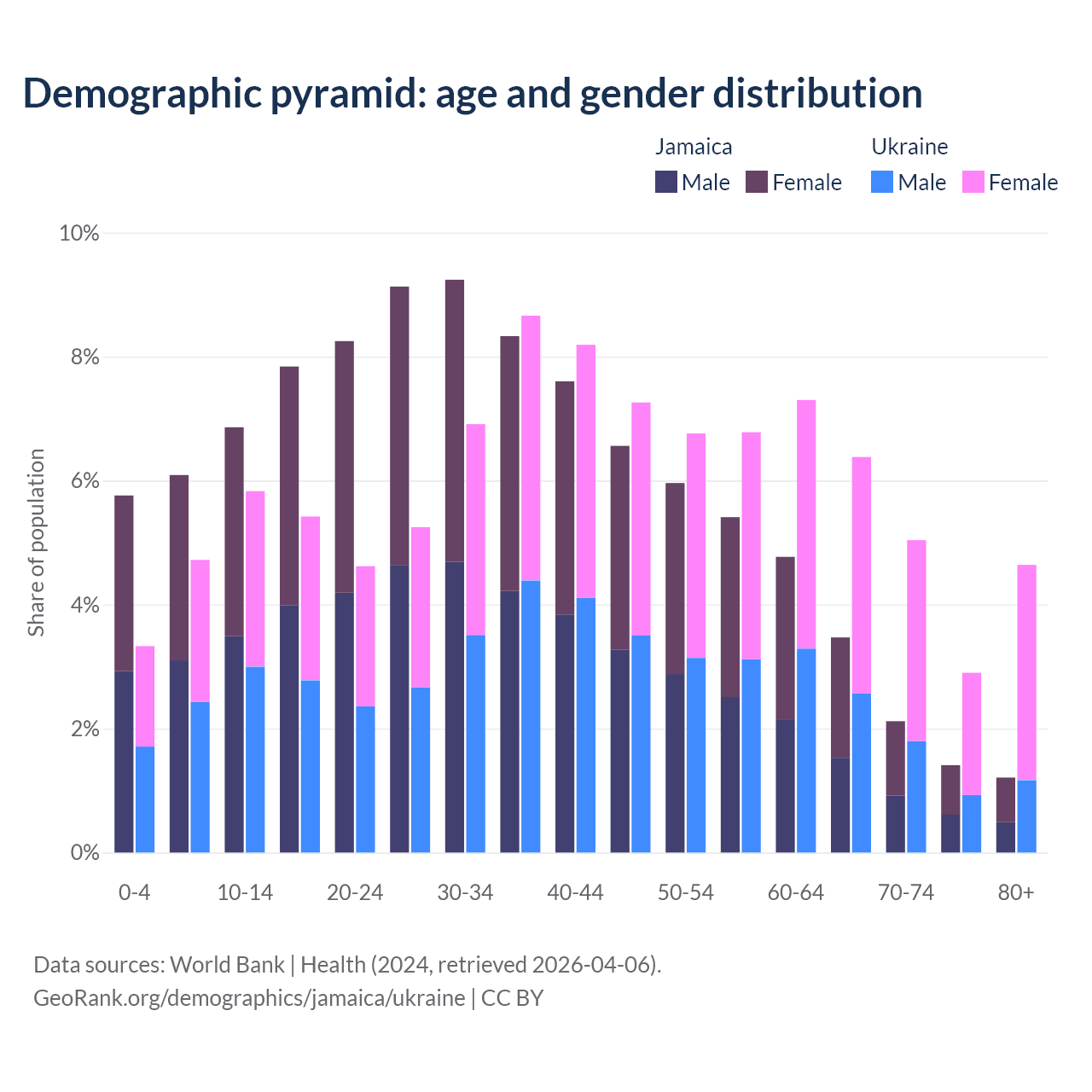 - Jamaica is ranked 87/196 by median age (oldest to youngest) vs 26/196 for Ukraine.