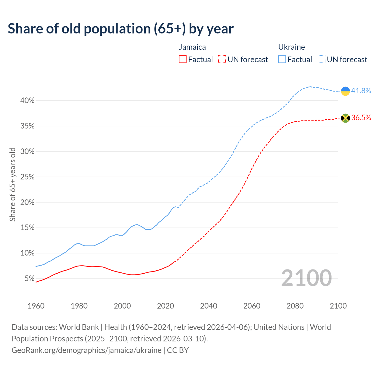 The share of older people aged 65 and over is 8.21% in Jamaica and 19% in Ukraine. Life expectancy in Jamaica compared to Ukraine .