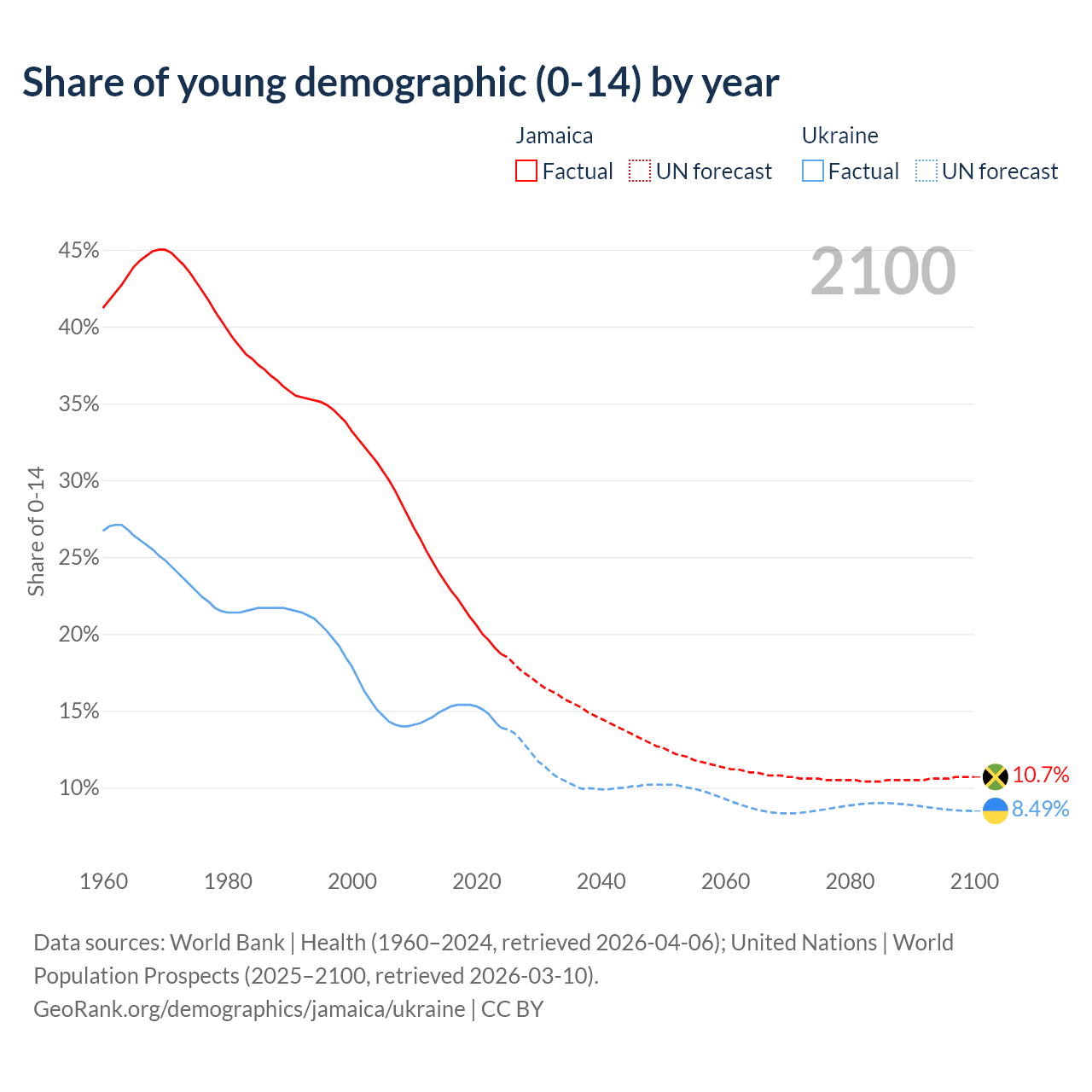 - The share of young demographic (0-15 years old) in Jamaica is 18.7% vs 13.9% in Ukraine.