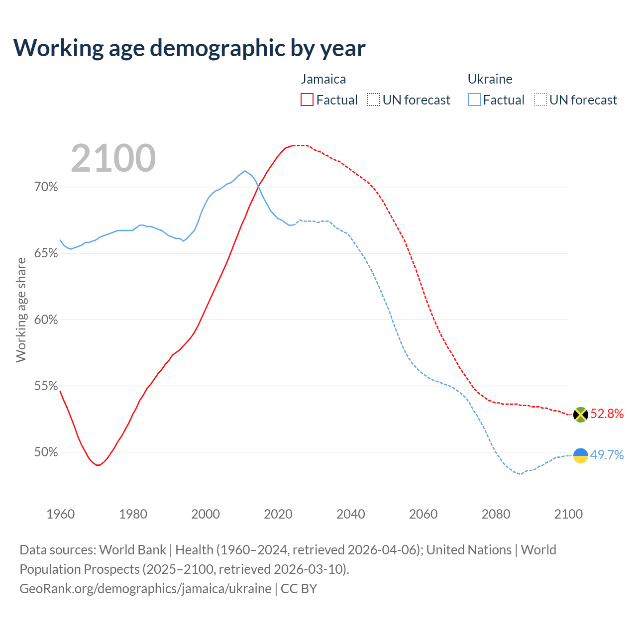 - Jamaica has 2.07M working age adults (aged 15-64) vs 26.9M in Ukraine.