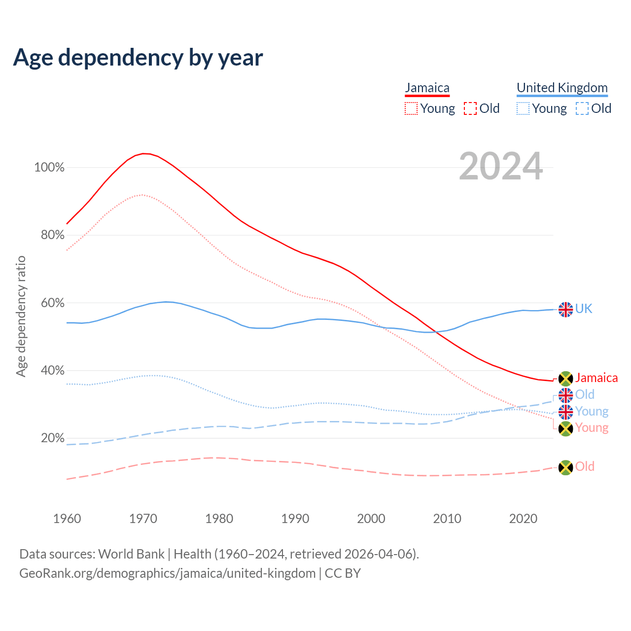 Data sources: World Bank | Health (1960–2024, retrieved 2026-04-06); U.S. Census Bureau (1960–2024, retrieved 2026-02-08).