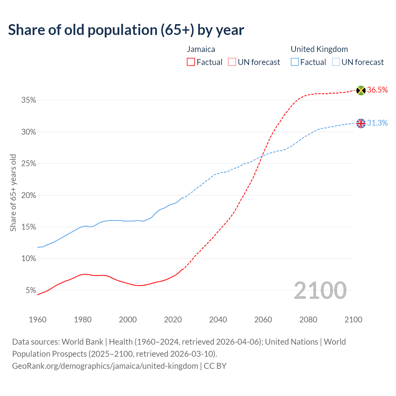 The share of older people aged 65 and over is 8.21% in Jamaica and 19.5% in the United Kingdom. Life expectancy in Jamaica compared to the United Kingdom .