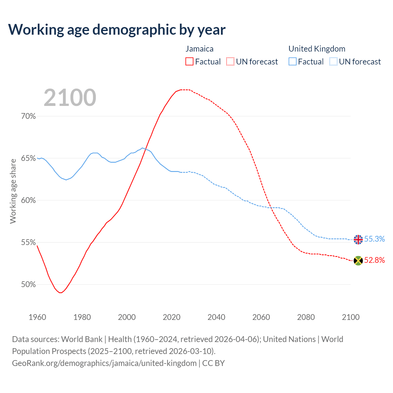 Median age Jamaica vs United Kingdom, 1960-2100