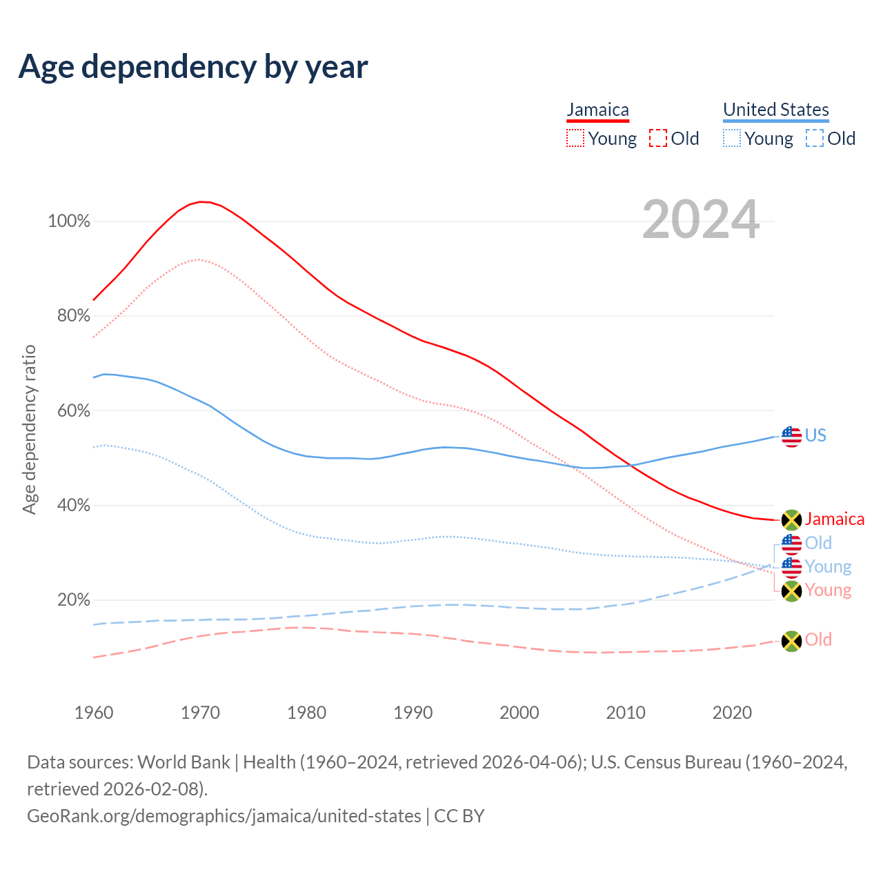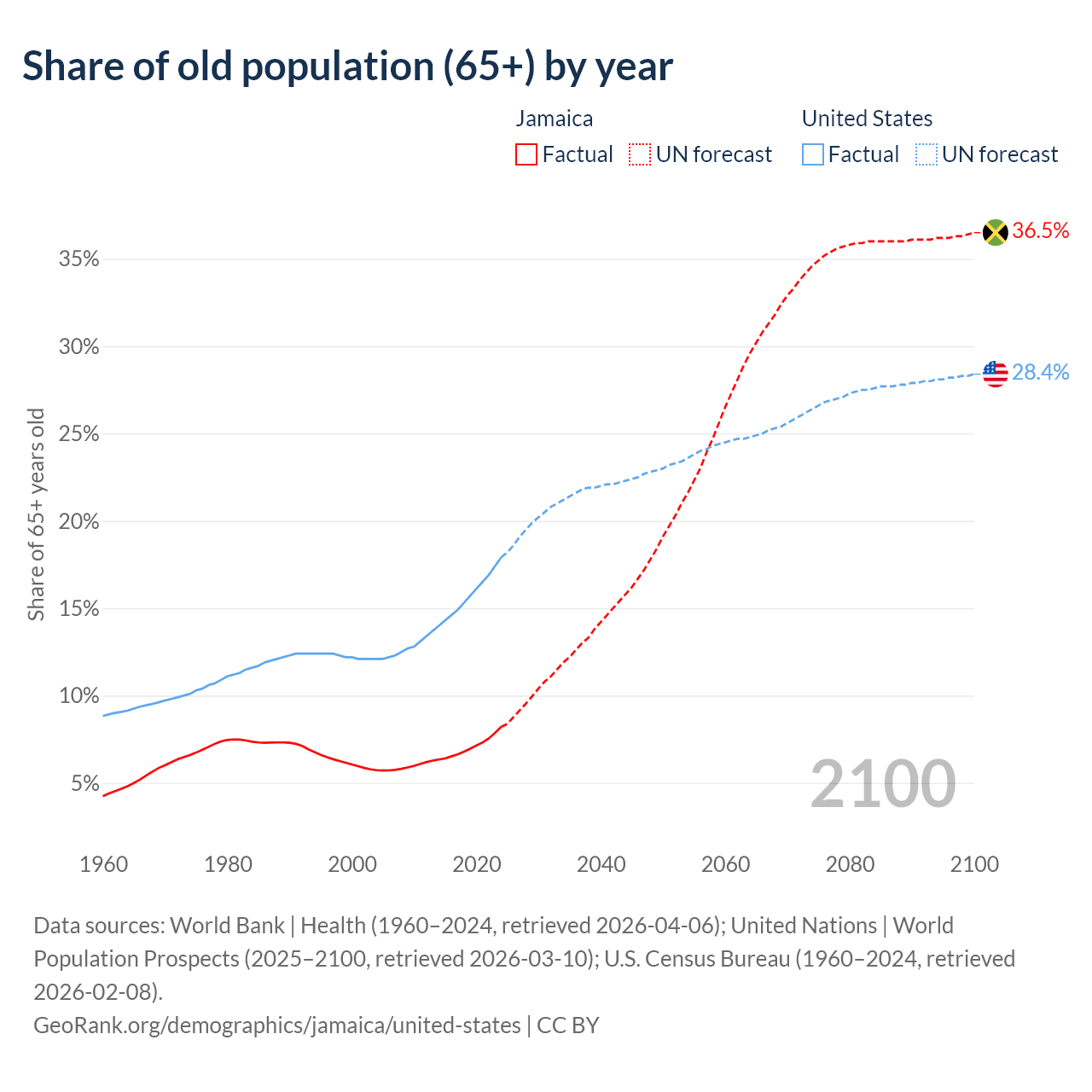 - The share of old-age demographic (65+) in Jamaica is 8.21% vs 17.9% in the United States.
