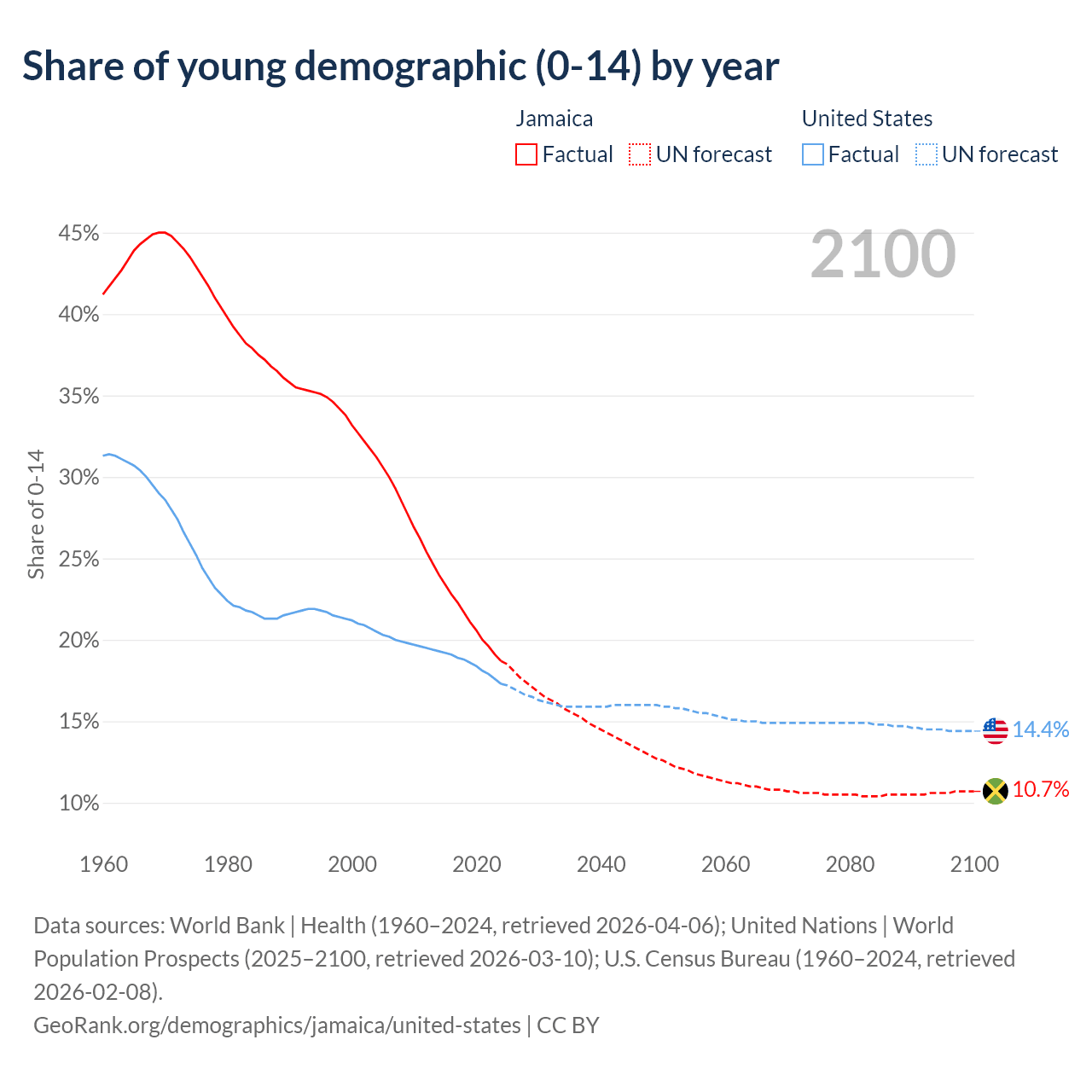 - The share of young demographic (0-15 years old) in Jamaica is 18.7% vs 17.3% in the United States.
