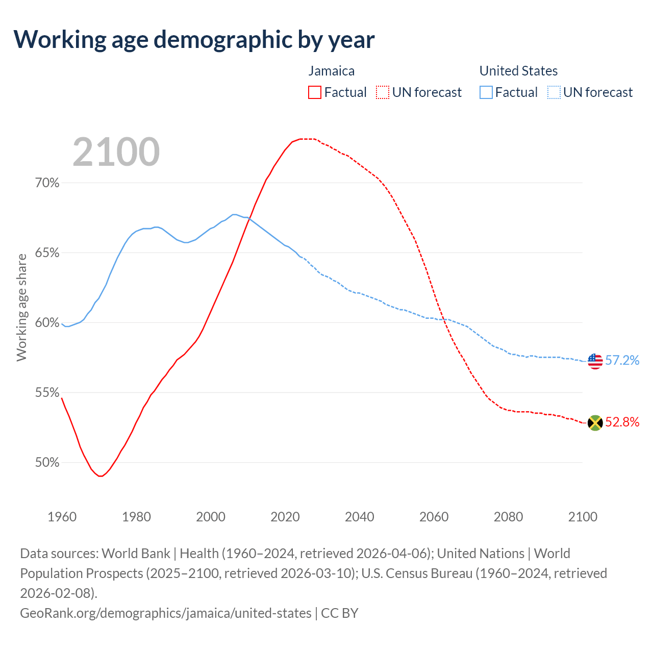 - Jamaica has 2.07M working age adults (aged 15-64) vs 223M in the United States.