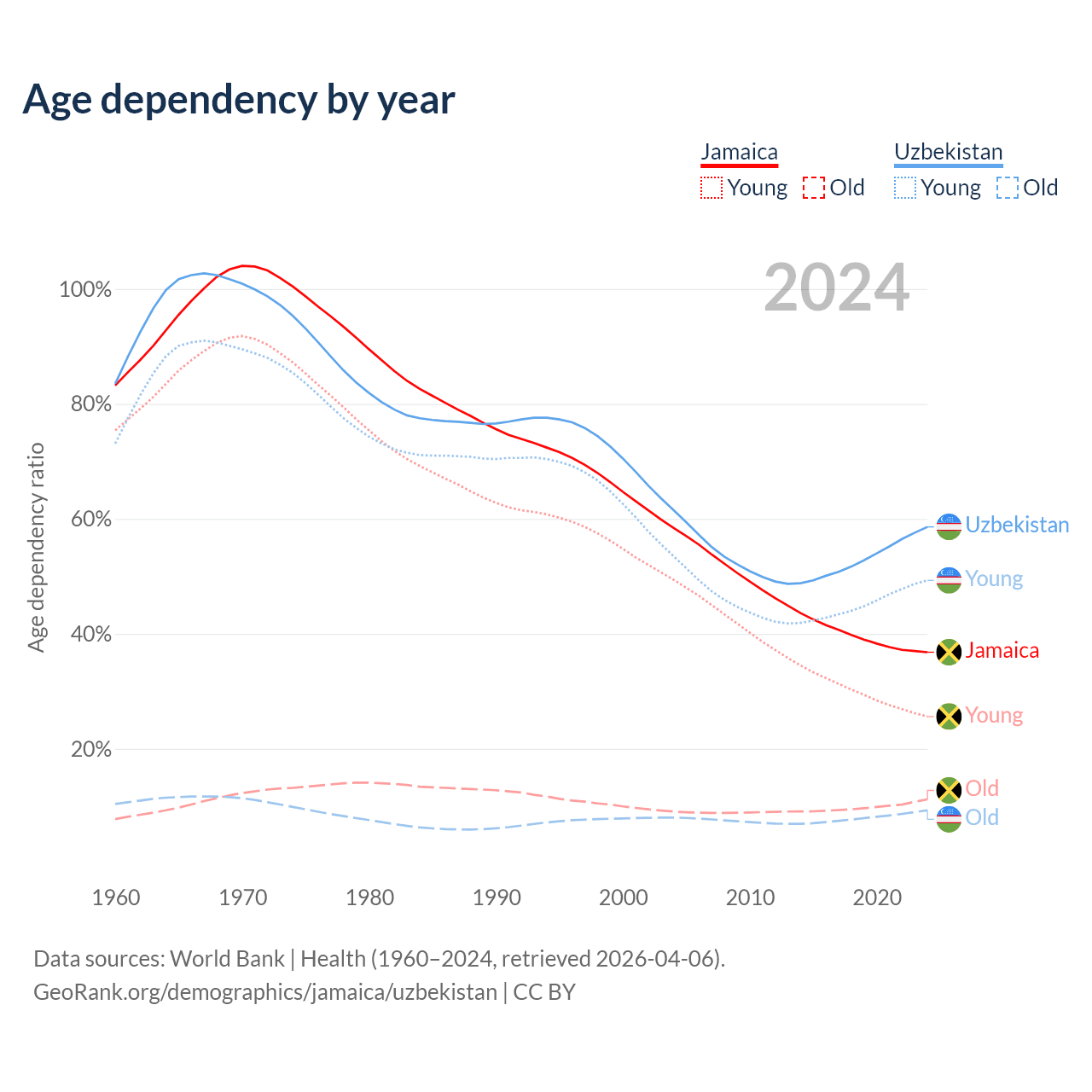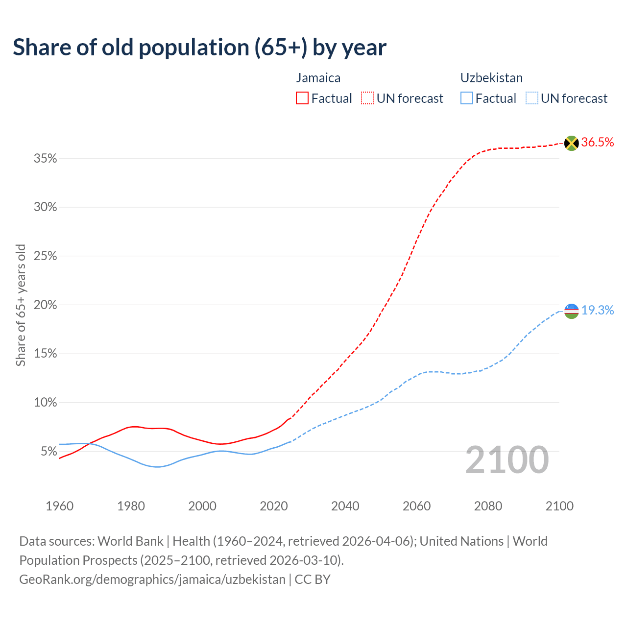 - The share of old-age demographic (65+) in Jamaica is 8.21% vs 5.86% in Uzbekistan.
