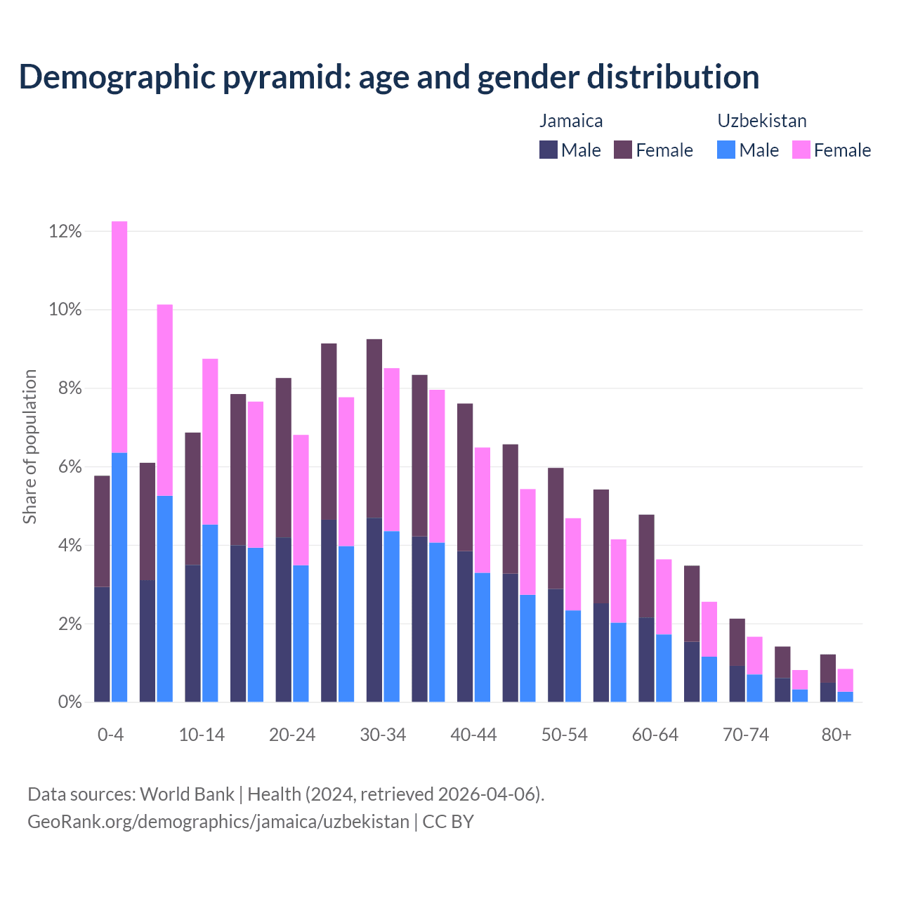 - Jamaica is ranked 87/196 by median age (oldest to youngest) vs 116/196 for Uzbekistan.