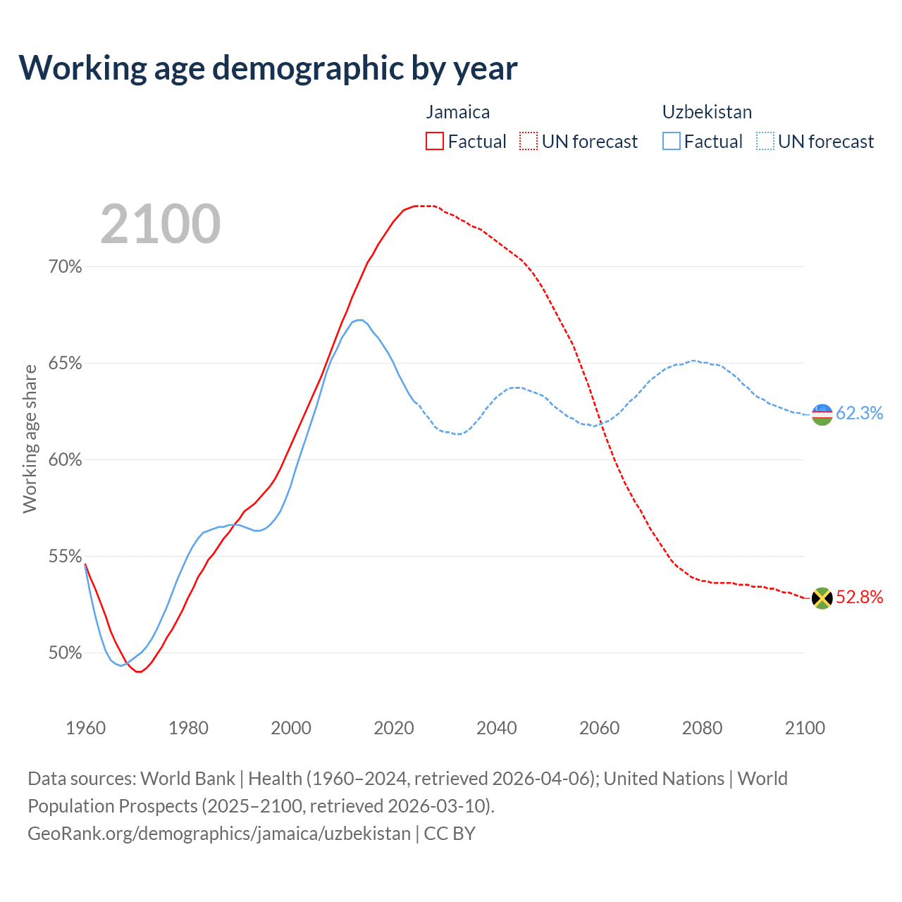 - Jamaica has 2.07M working age adults (aged 15-64) vs 23.9M in Uzbekistan.