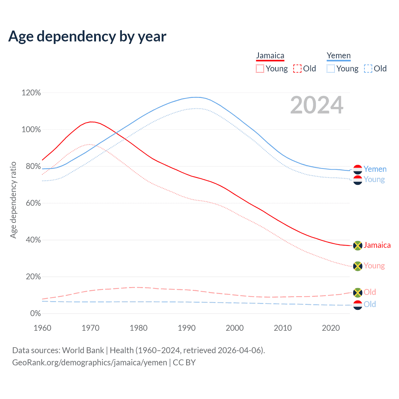 - The share of old-age demographic (65+) in Jamaica is 8.21% vs 2.52% in Yemen.