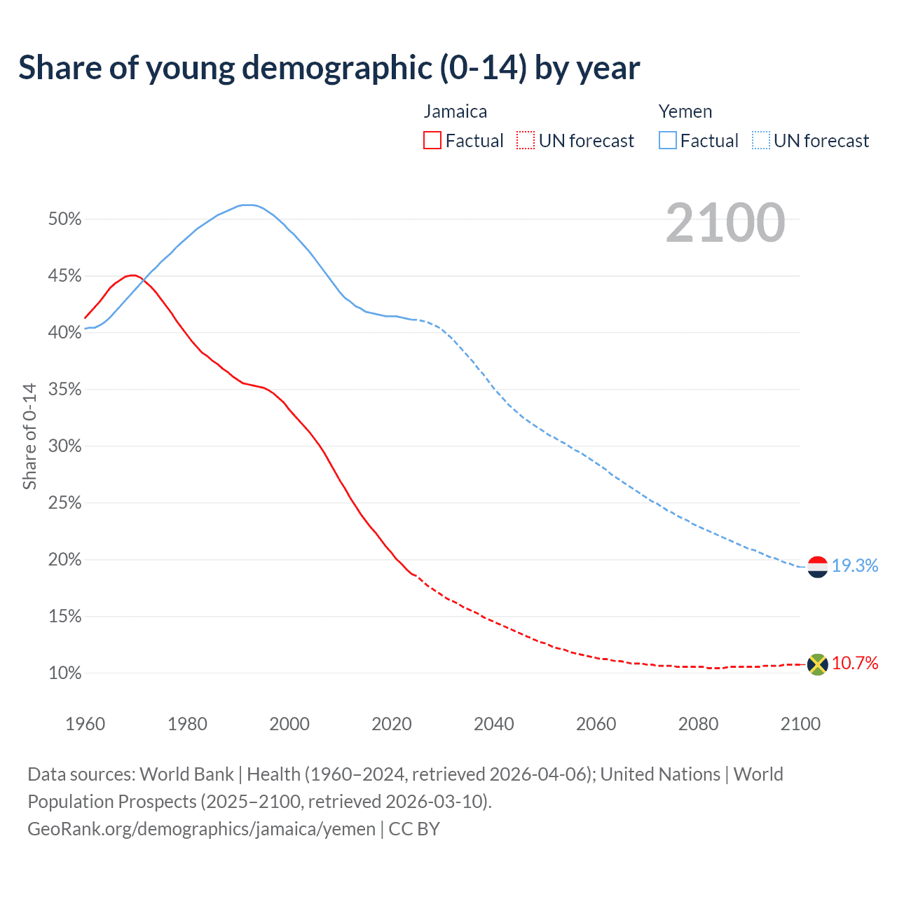 - The share of young demographic (0-15 years old) in Jamaica is 18.7% vs 41.1% in Yemen.