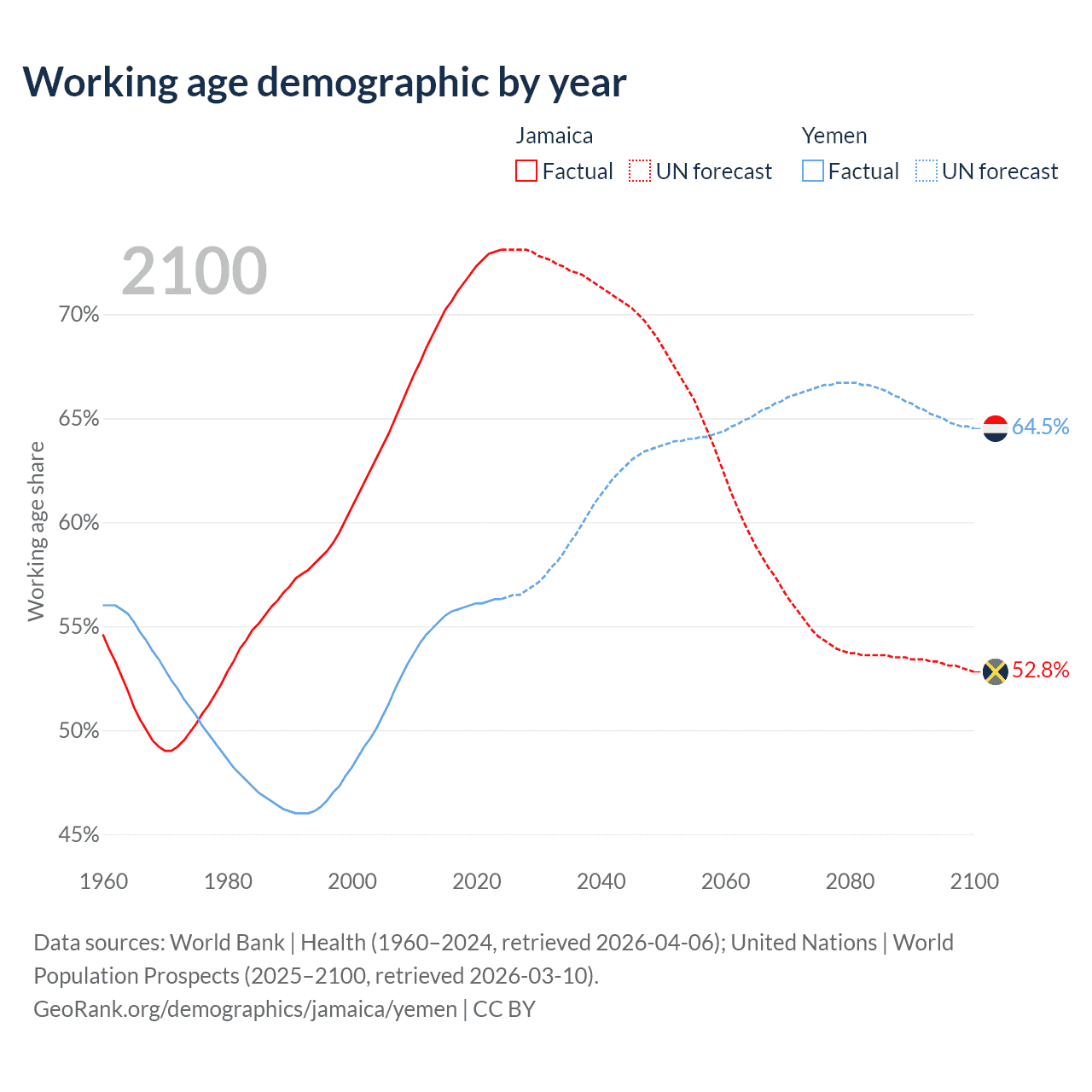 - Jamaica has 2.07M working age adults (aged 15-64) vs 24.4M in Yemen.